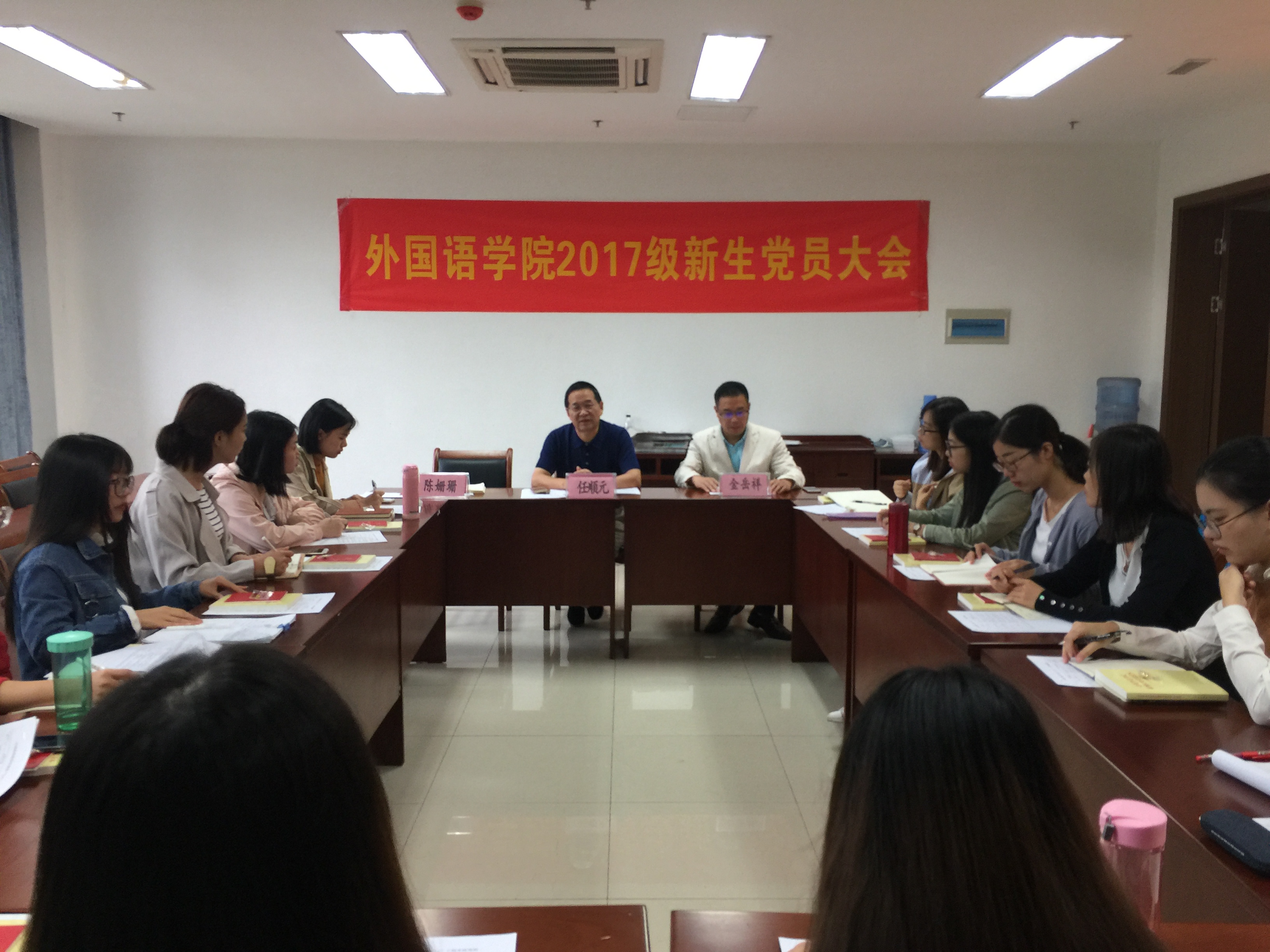 10月13日上午,永乐视频 党委在恕园19-208举行2017级新生党员大会,党委书记任顺元、党委副书记金岳祥、研究生辅导员林祯昊出席会议。兼职组织员、团委书记陈姗珊主持会议。任书记和金书记向新生党员讲授“入学第一课”。