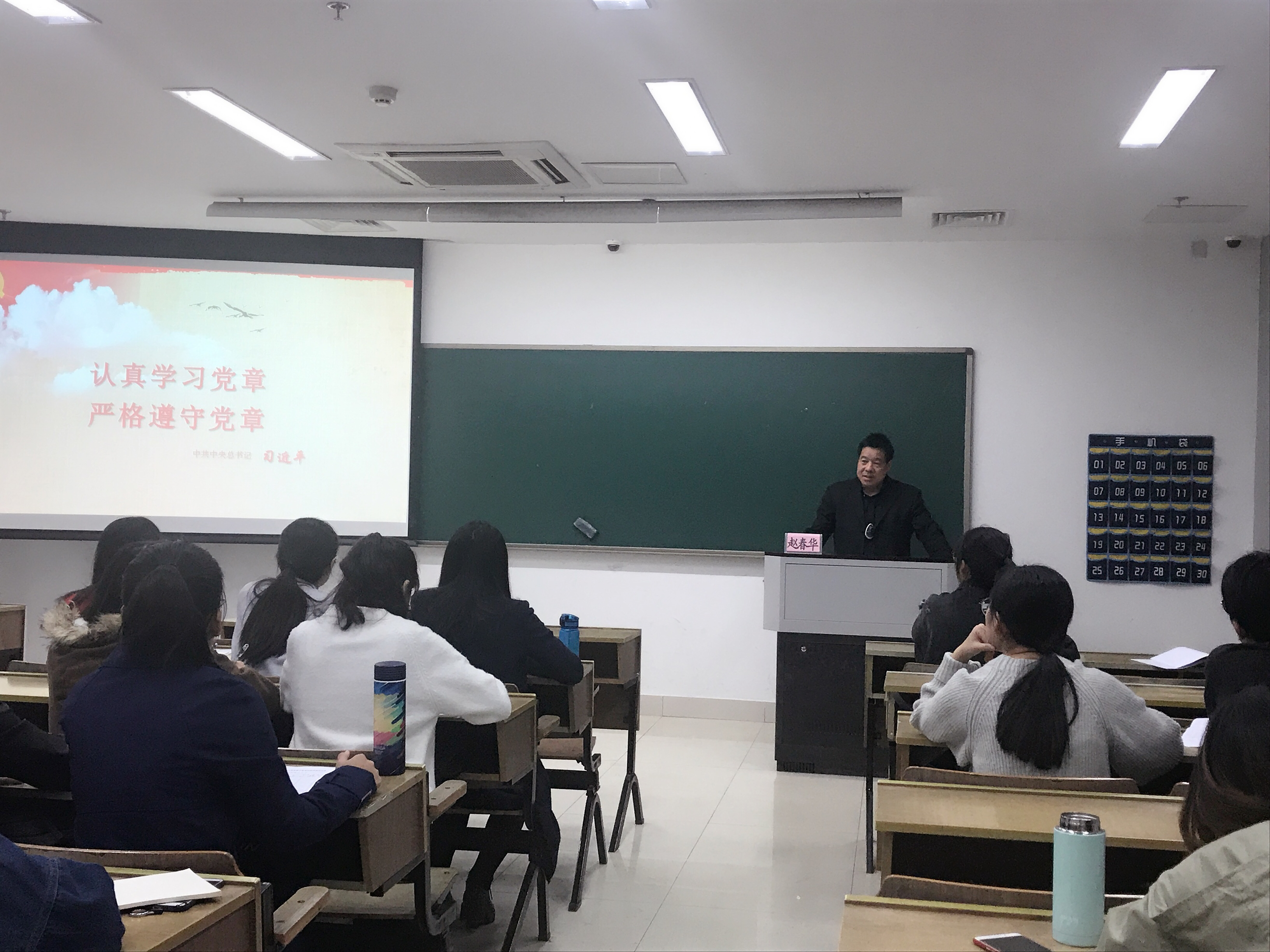赵老师详细阐述了“党章的概述 ”、“党章是党的光辉历史的见证史”、“十九大党章修改的重点和主要内容”、“实践党章,做一名合格党员”四方面内容,由浅入深、贴合实际,使全体学员对党的性质、理想目标、指导思想、基本要求、党员义务权利都有了更加深刻的理解。同时,赵老师结合“十九大”精神,提出学习和遵循党章应做到“五个结合”:要把学习党章同学习党的十九大精神紧密结合起来;要同习近平新时代中国特色社会主义思想紧密结合起来;要把学习党章的基本知识和领会精神实质结合起来;要把学习党章和学习其他党内法规相结合;要把学习贯彻党章和工作实际相结合。赵老师勉励全体学员要进一步坚定理想信念、加强道德修养,不断提高自身的政治思想觉悟。
