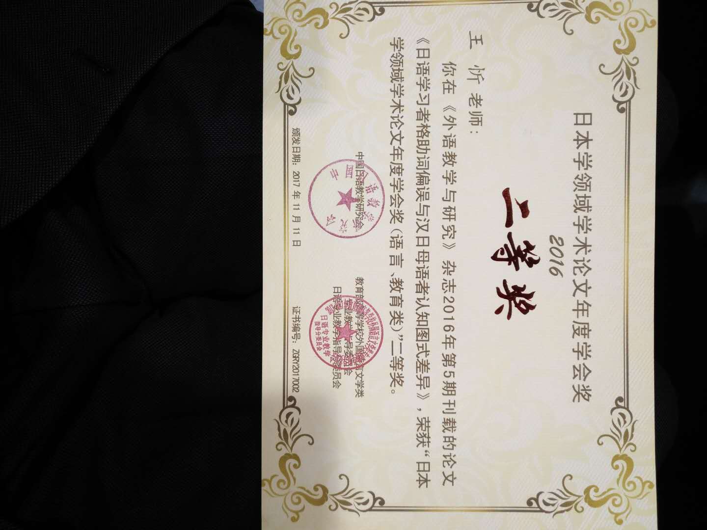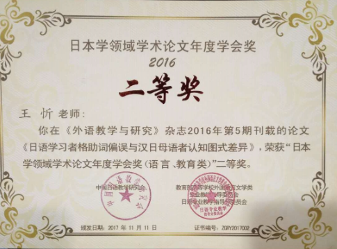 王忻老师荣获日本学领域学术论文年度学会奖二等奖