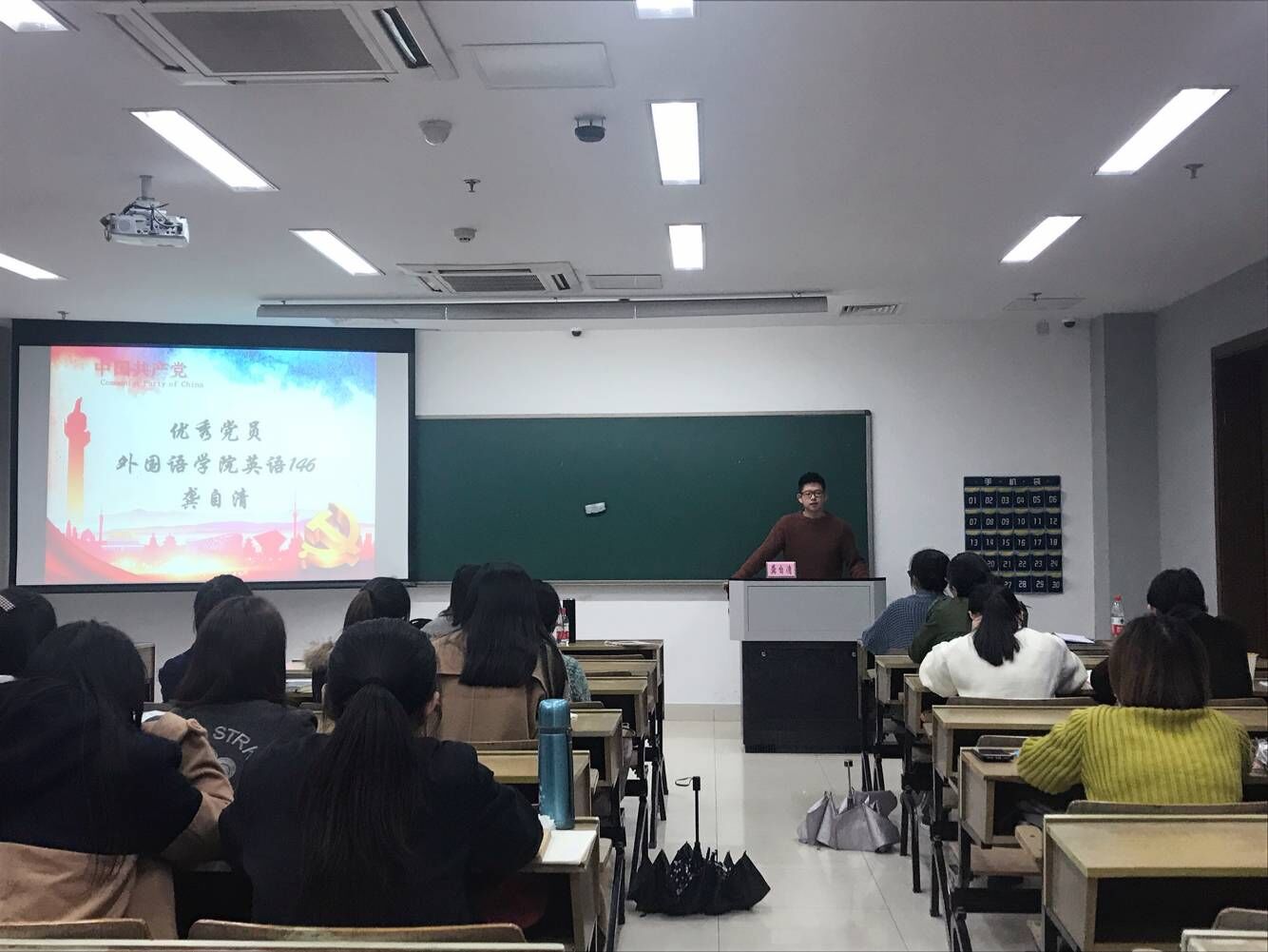 11月15日下午,永乐视频 分党校第五十八期发展对象培训班“优秀党员面对面”座谈调研活动于恕园12号楼107教室举行。本次座谈调研活动的主题是“仰望星空,脚踏实地”,应邀参加活动的两名主讲人为两位优秀党员:英语语言文学16级研究生秦勇青同学与英语146龚自清同学。两位优秀党员和大家分享了自己入党历程,勉励大家应积极发挥党员的先锋模范作用。