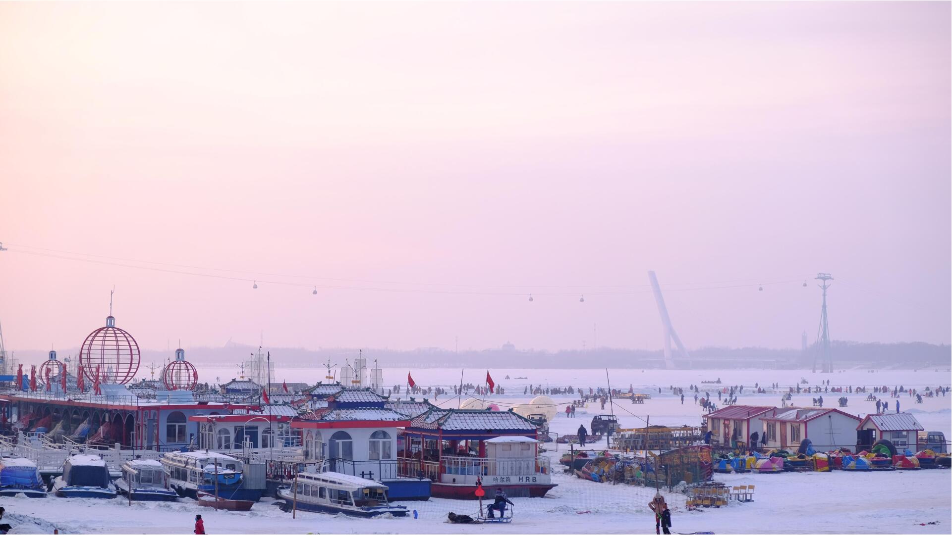 虽然气候极寒,但是北方人却生来热情豪迈,与雪共舞。松花江一到冬天就成了当地人的游乐场,大人小孩都在冰上尽情享受与冰雪世界的亲吻。