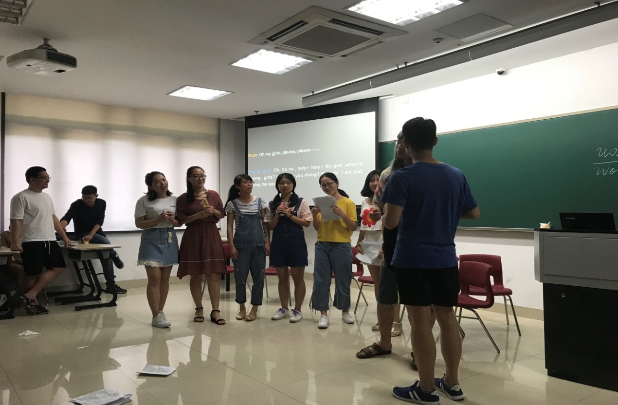 永乐视频 教师对研究生公共英语课堂上采用戏剧表演的方式对研究生的英语教学进行了创新和实践。戏剧主题是“Mum is to Marry me off”, 讲的是妈妈给女儿们相亲的故事。学生对于这种课堂教学形式非常认同,经过两个月的积极准备和排演,5月16日,在课堂上进行了最后的演出,学生全情投入,口语发音和表演非常到位,获得了成功。