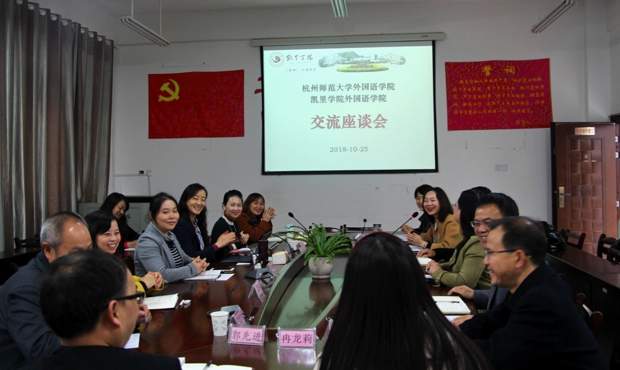 2018年10月25日,永乐视频 李颖副院长一行赶赴贵州凯里学院,展开交流合作考察。上午,凯里学院副院长贺华中、教务处处长周江菊会见了李院长一行,双方交流了各自的办学情况和教学理念。李颖副院长介绍了杭师大的办学理念和成果积淀,与凯里学院领导交流了接下来的交流领域和合作愿景。