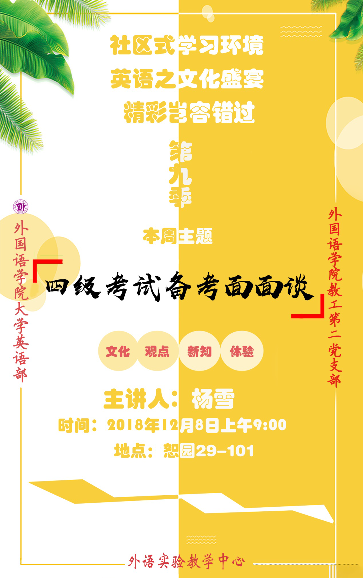 在永乐视频 教工第二党支部的引领下,结合大学英语教学改革的实际,为在校学生营造良好的社区式英语学习氛围,从而提升学生的英语学习水平,扩大学生的视野,支部所属的大学英语教学部为全校学生开设的周末英语专题讲座活动目前已经进入了第九季第八期。