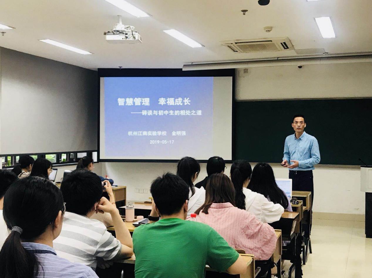 2019年5月17日,学科教学(英语)专业硕士点双师课程系列讲座二在恕园11-107顺利进行,来自杭州江南实验学校正高级教师金明强老师呈现了一场精彩的《教师专业发展》课程。