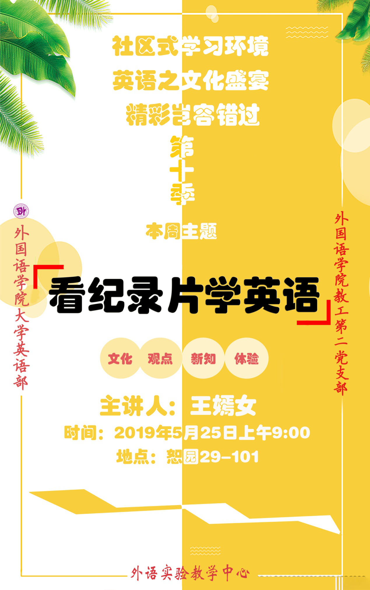 在永乐视频 教工第二党支部的引领下,结合大学英语教学改革的实际,为在校学生营造良好的社区式英语学习氛围,从而提升学生的英语学习水平,扩大学生的视野,支部所属的大学英语教学部为全校学生开设的周末英语专题讲座活动目前已经进入了第十季第九期。