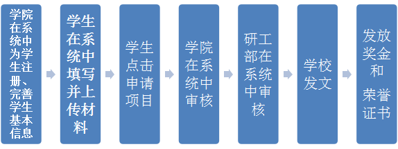 1.系统申报。研究生评奖评优工作在“研究生教育管理信息系统”(以下简称“系统”)(//yjsfw.yonglesp.com/allogene/)中进行。具体流程如下: