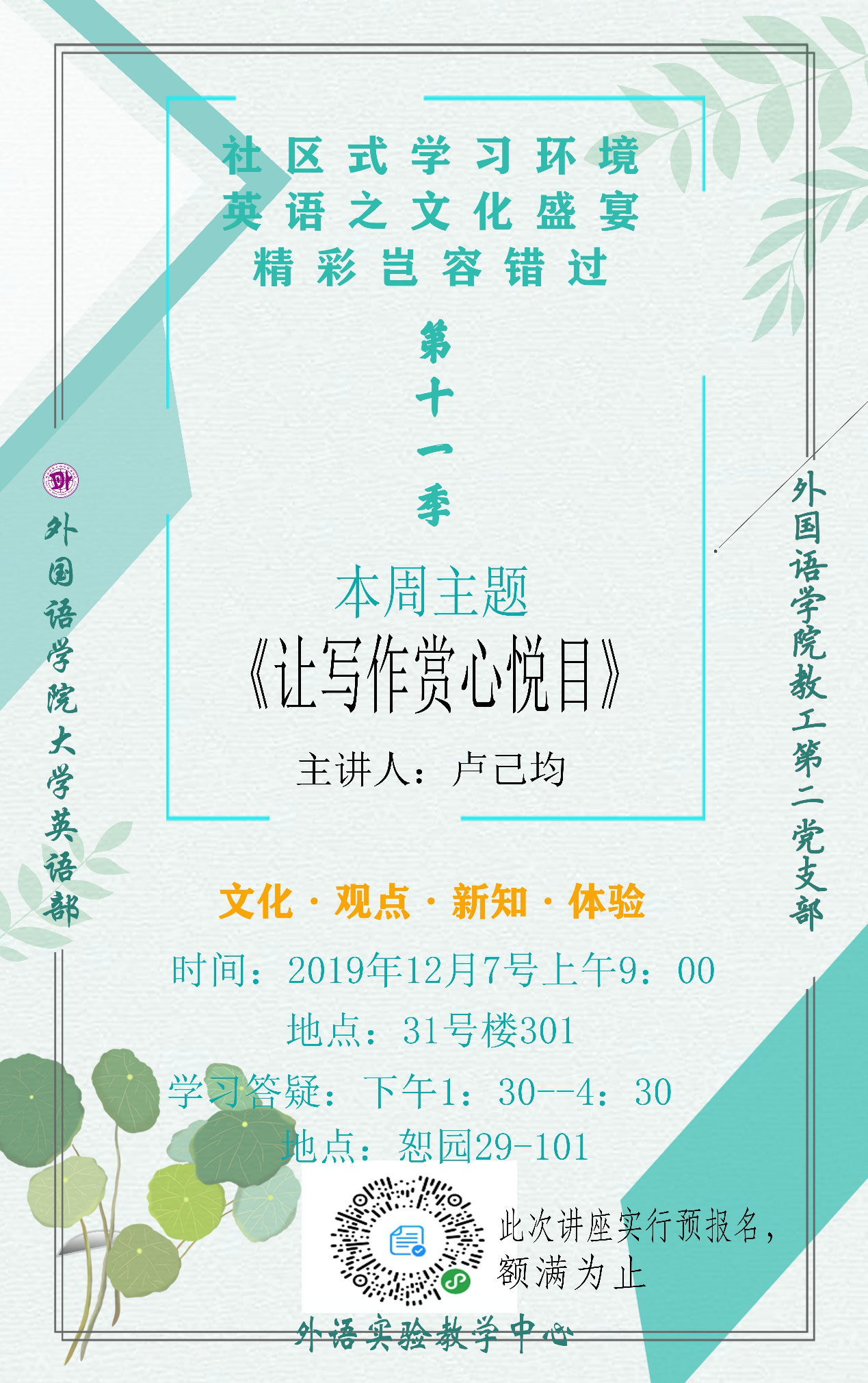 在永乐视频 教工第二党支部的引领下,结合大学英语教学改革的实际,“不忘初心、牢记使命”,为在校学生营造良好的社区式英语学习氛围,从而提升学生的英语学习水平,扩大学生的视野,支部所属的大学英语教学部为全校学生开设的周末英语专题讲座活动目前已经进入了第十一季第八期。