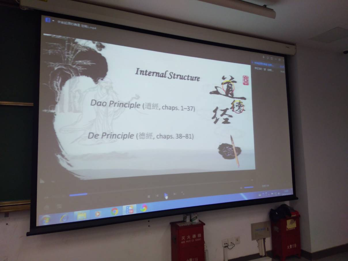 2019年12月21日上午九点,一如往常每个周六,每周一次的英语文化沙龙系列讲座又如期而至。本次讲座由大外部的党员段林远老师主讲,讲座主题是“道家哲学知多少”。段老师首先简单介绍了哲学探讨的两大领域,即宇宙论和伦理学,然后过渡到道家哲学所探讨的两个核心内容,“道”和“德”,及两者关系。段老师带领同学们重点梳理了老子做为宇宙起源的“道”的内涵,以及庄子怎样继承并发扬老子“有”和“无”的哲学概念,提出“无用之大用”的思想。