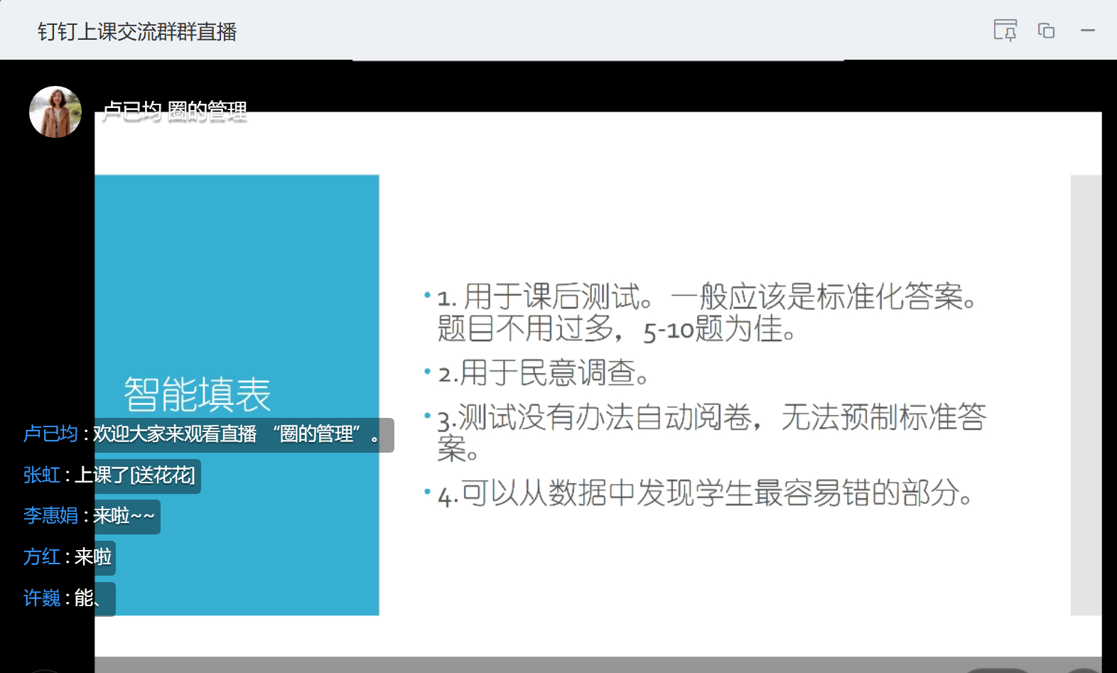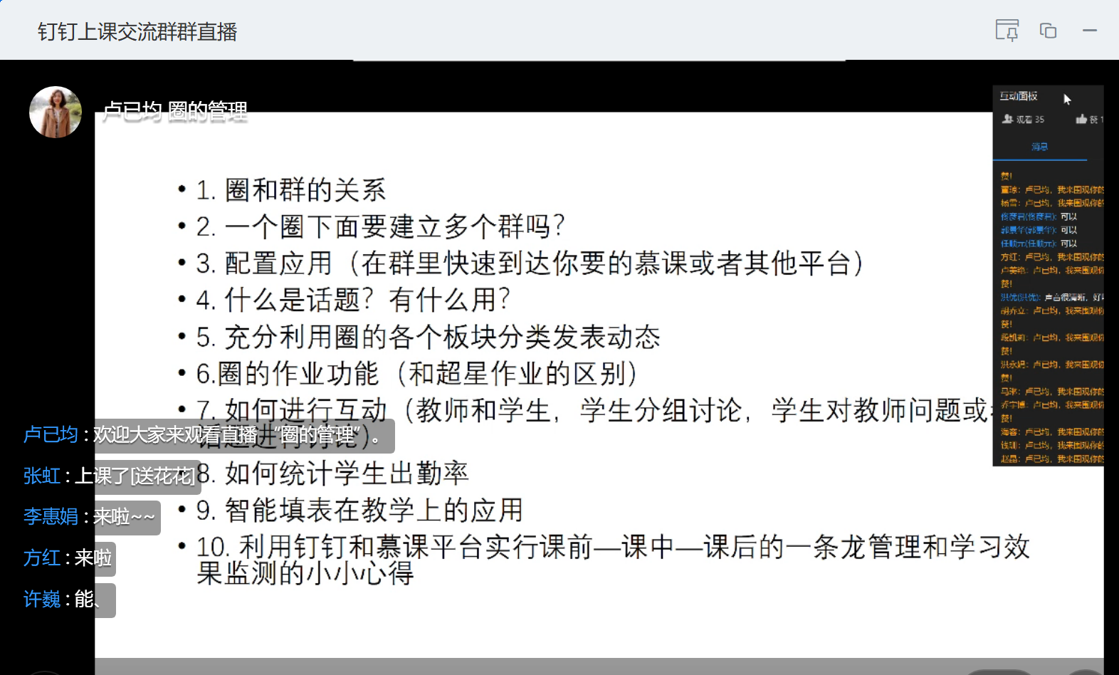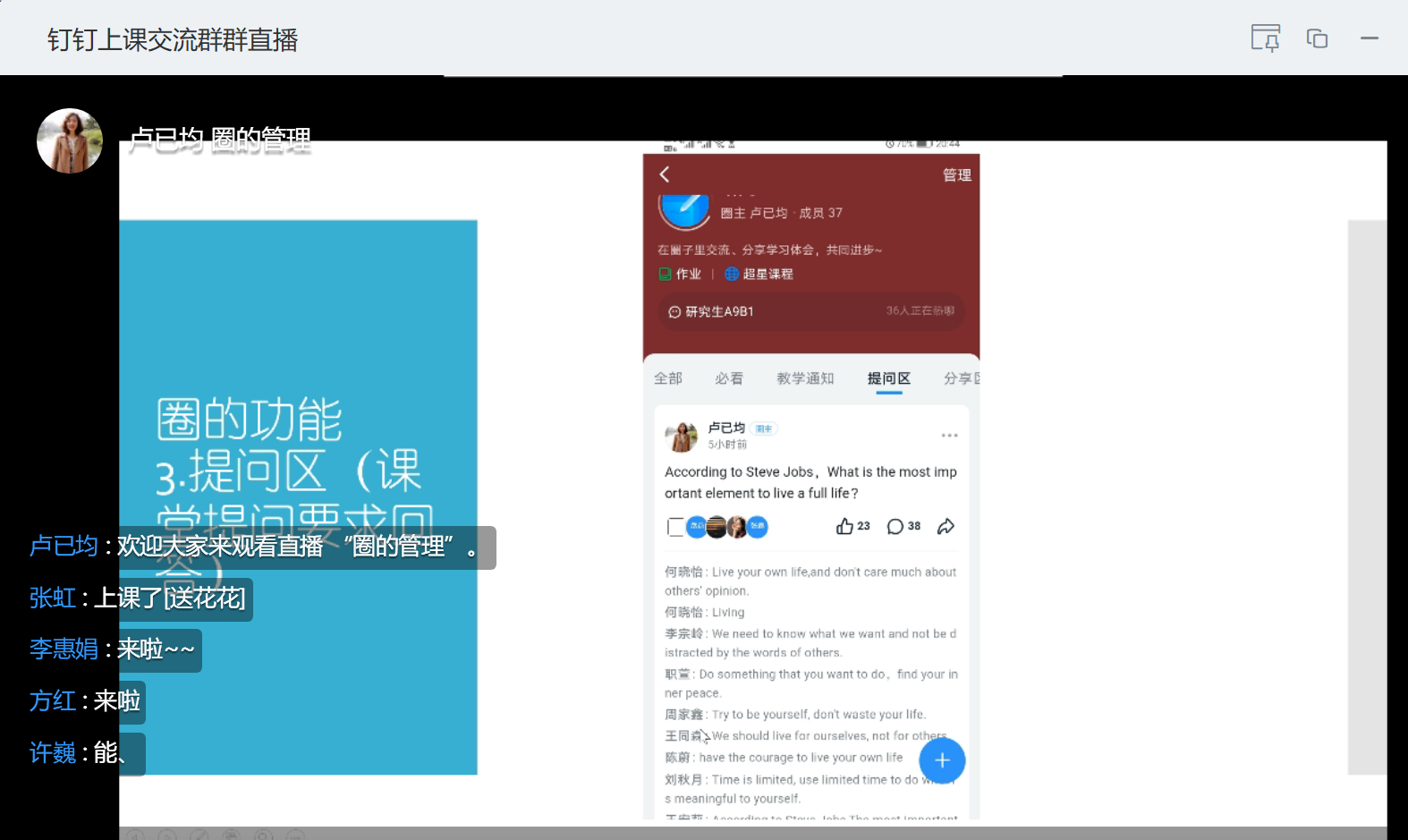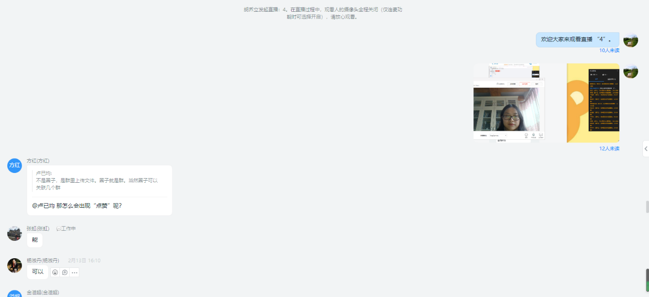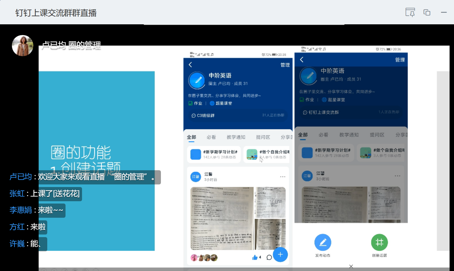 胡老师就钉钉直播平台不同功能的使用;具体的线上教学活动的组织;学生的管理与激励等分享了宝贵的经验。参与的教师们在认真观摩基于钉钉平台的直播讲课,微课播放,课堂签到,语音和连麦发言、禁言、作业布置、教学圈搭建等各个操作细节的同时,也及时对线上教学中的困惑和可能存在的问题进行了探讨。