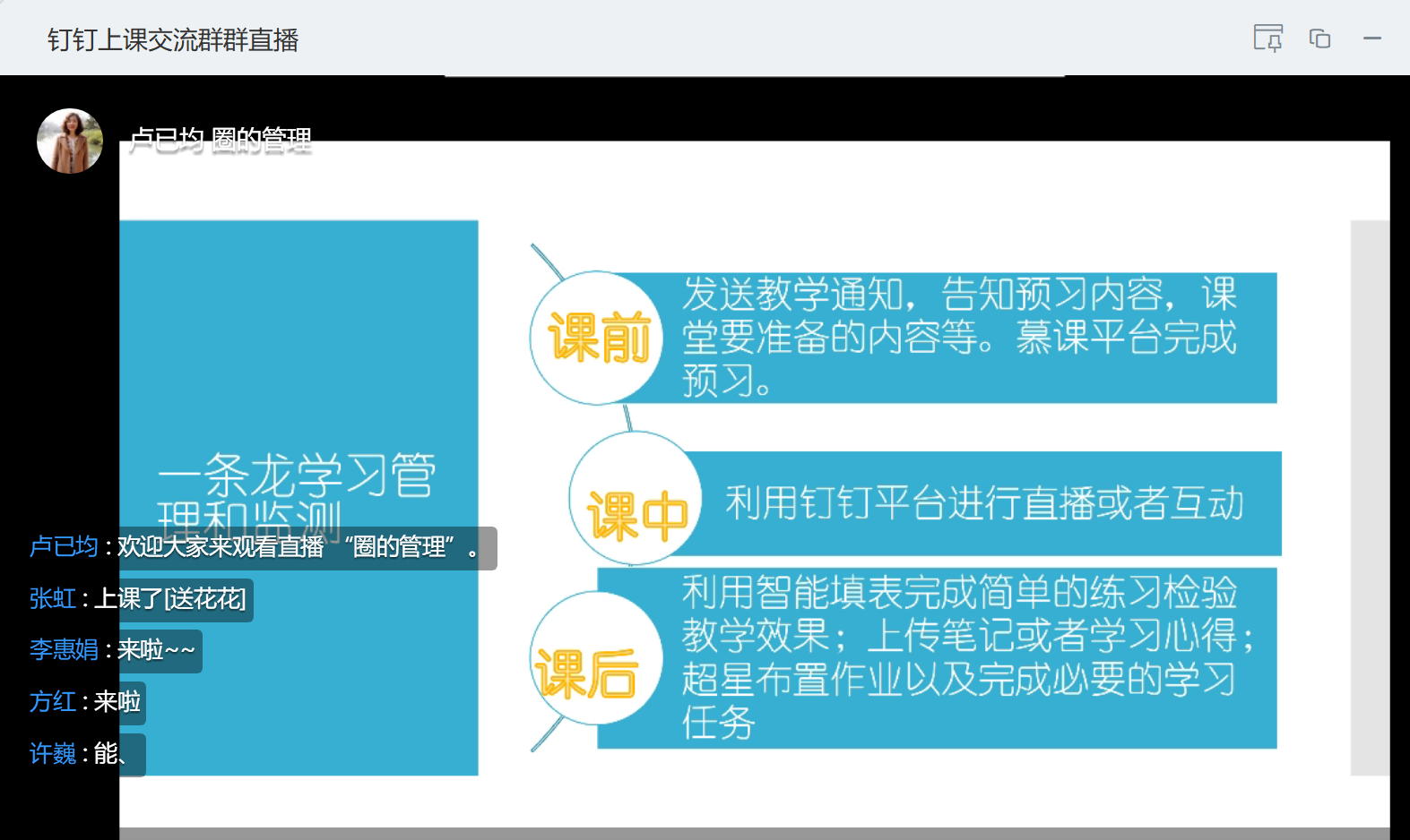 卢已均老师在假期深入摸索钉钉群的各项功能,探索其与外语教学的契合度,挖掘延伸功能,在研讨中与老师们分享了她的“一条龙学习管理和监测”。