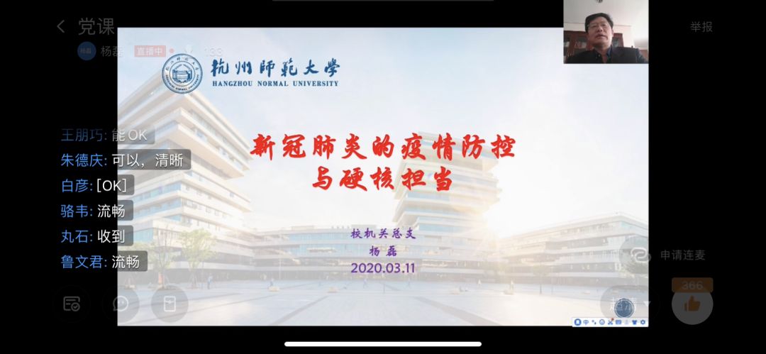 3月11日下午2点,永乐视频 学生第二党支部组织开展“疫情防控知识”专题学习,与结对支部教务处、教师教学发展中心党支部在线聆听杨磊副校长主讲《新冠肺炎的防控与硬核担当》专题党课。永乐视频 党委书记任顺元与党委副书记、纪委书记王倩也参加了党课学习。
