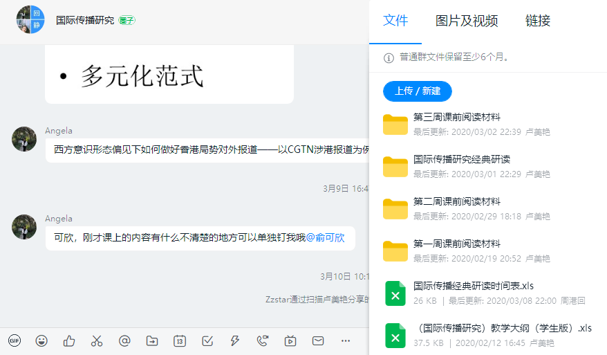 国际传播学的课程里,卢老师以周的间隔、电子的形式、定期的分享给我们一些较好的文献和书籍(如图2)。在这样的形式下,我们实现了真正的“无纸化”学习。学生的内容展示也结合直播、录播、视频会议的方式,以最优化的形式将知识以最简单的形式传递到课堂之中,实现课堂中和课余时的最高效学习。同时,文件内容的多人同时编辑,在最短的时间内,以最便捷的方式实现讨论和记录。