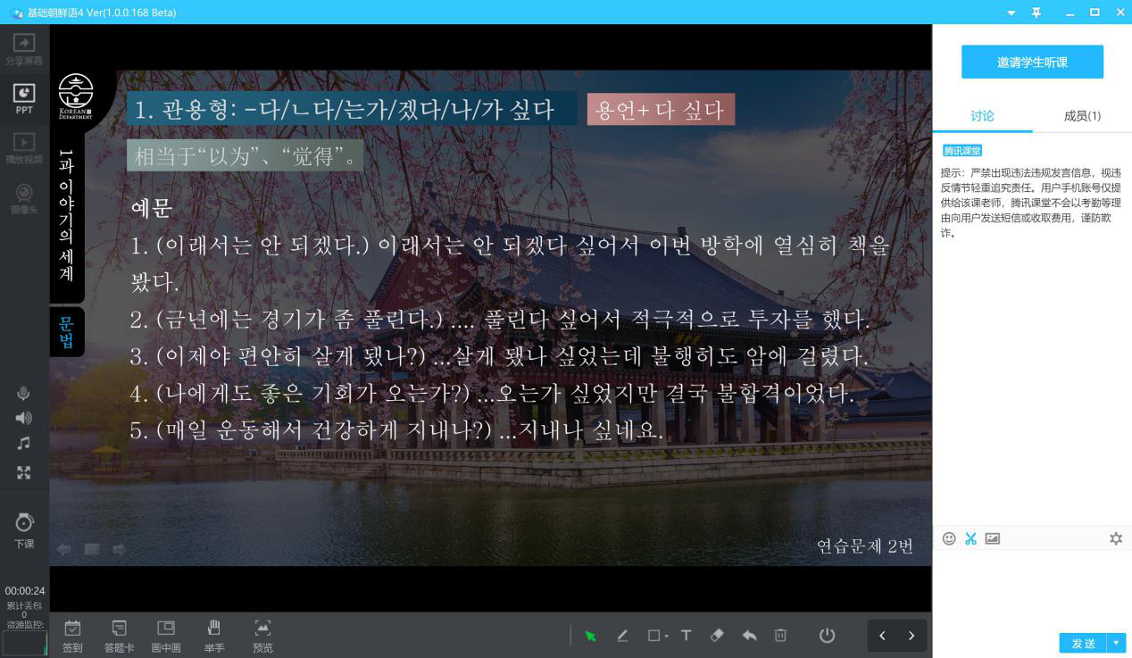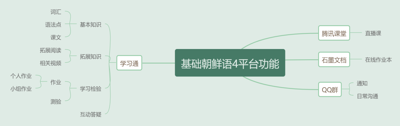 《基础朝鲜语4》采用“学习通”、“石墨文档”、“腾讯课堂”、“QQ群聊”等多平台联动形式,充分利用各平台优势,实现了实时互动和留言互动以及教学活动的课前、课中、课后全覆盖。