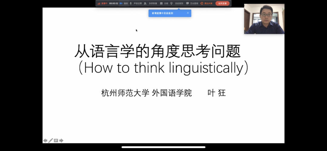 5月6日下午,永乐视频 在线上开展了第九十一期师大外语讲座,由叶狂教授担任主讲。活动中,教授以“从语言学的角度思考问题”为主题,剖析社会现象和历史问题背后的语言学解释,进一步讨论了语言和思维的关系。