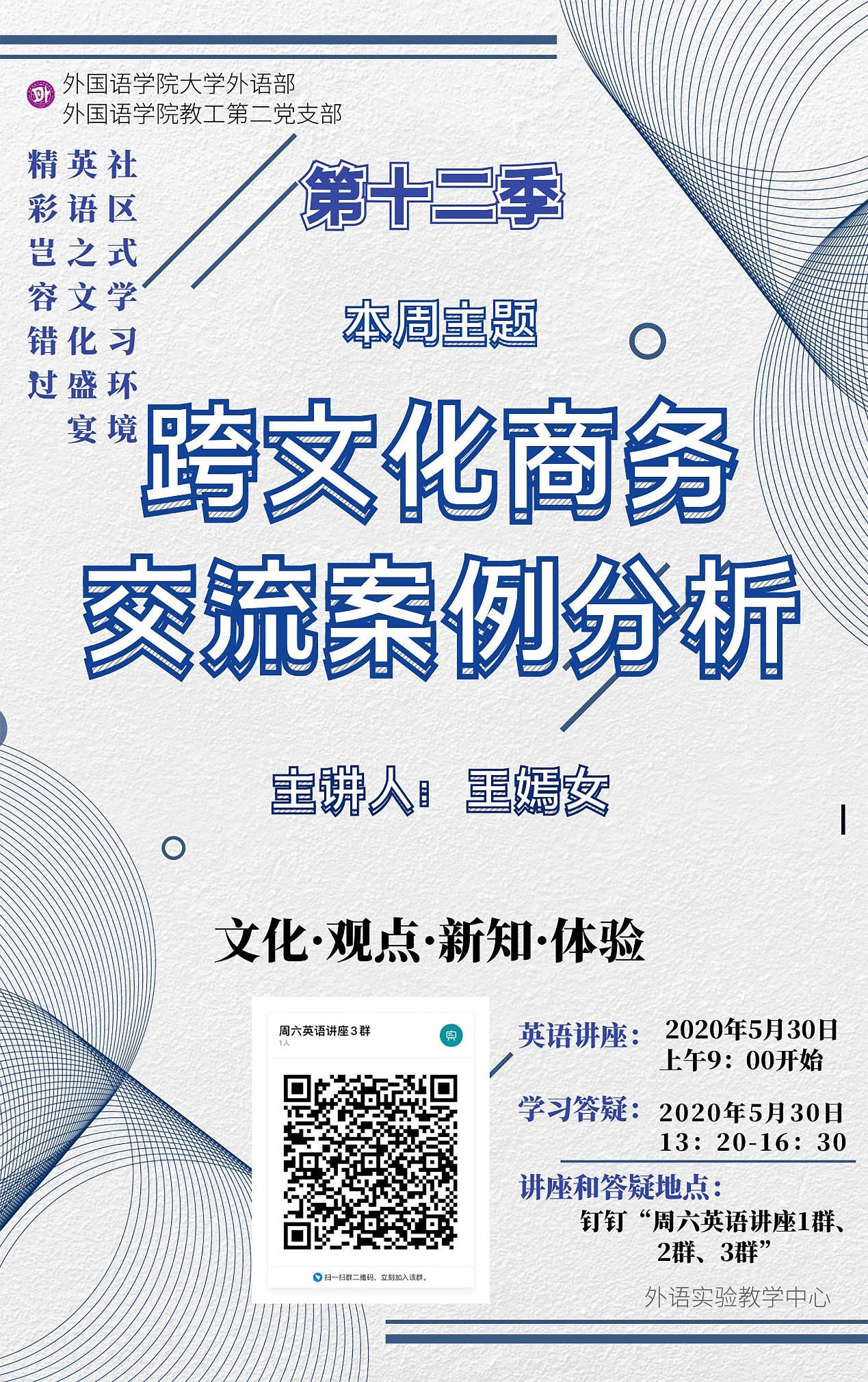 为更好地服务广大学生、满足其对英语学习的多样化和个性化需求,结合大学英语教学改革的实际,为在校学生营造良好的社区式英语学习氛围,从而提升学生的英语综合能力,大学外语部和教工第二党支部为全校学生开设的周末英语专题讲座活动目前已经进入了第十二季第九期。