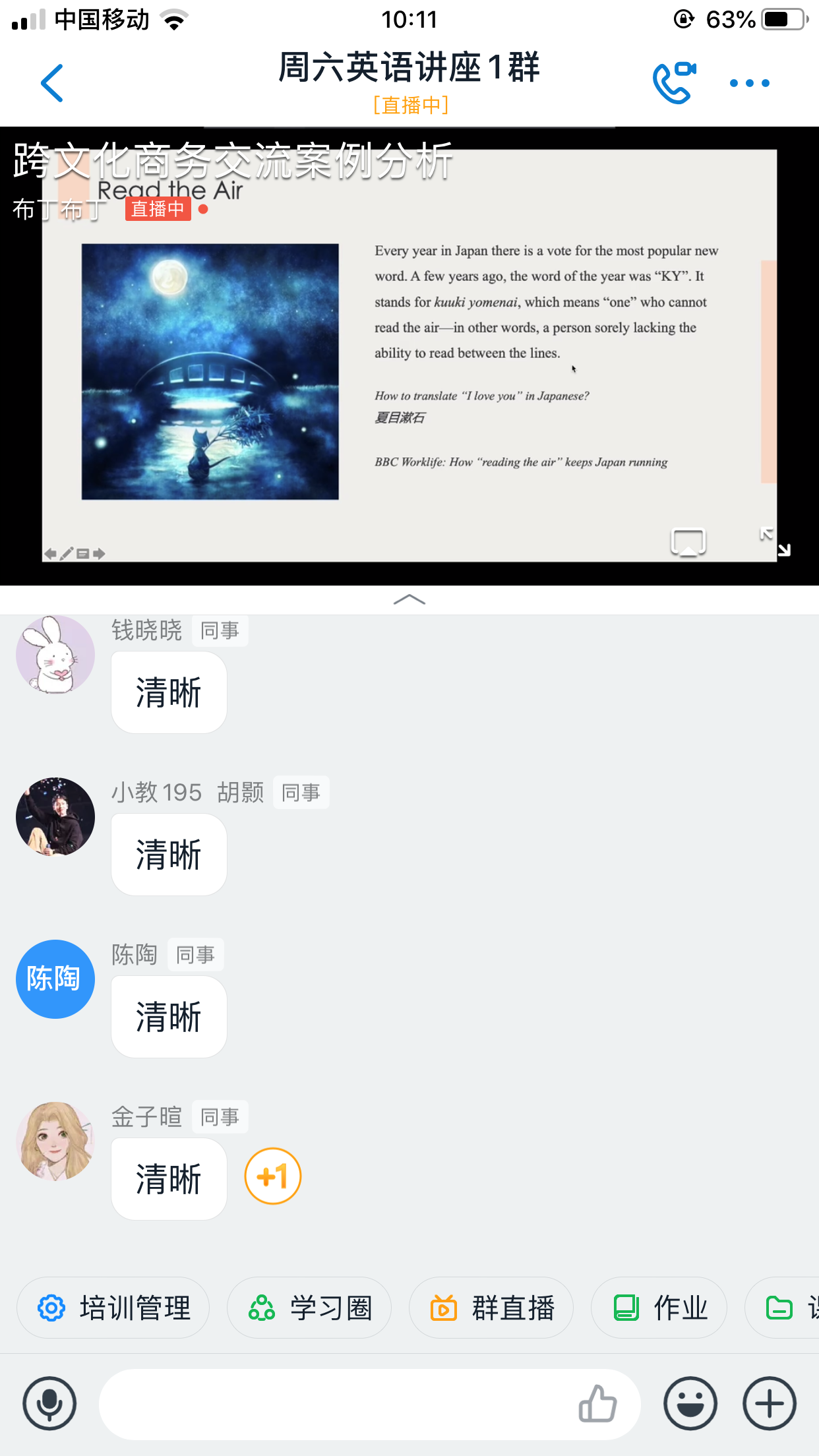随着周六讲座在学生中的口碑效应,讲座群数目前已增加到3个,加入讲座群的学生总人数已达到1947人,由于部分学生时间冲突,截止到5月30日晚12点,本次讲座实际参与学生数为1215人,已连续七周突破1000人次,同时,依然源源不断有学生选择直播回放,继续在“周六英语学习社区”里努力学习。学生来源主要为2019级非英语专业的学生,同时,也吸引了部分英语专业及浙江永乐视频 的学生来参加学习,观看直播的总人次达到1658次。