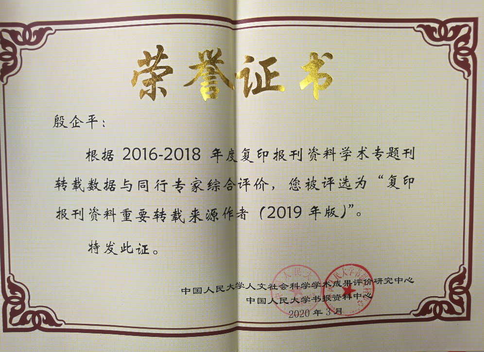 近日,中国人民大学人文社科学术成果评价研究中心与中国人民大学书报资料中心联合发布《复印报刊资料重要转载来源作者(2019版)》名录。根据2016-2018年人大复印转载数据和同行专家评议结果,中心共评选出883名人文社科学者。其中,全国外国语言文学界仅有3人入选,我校永乐视频 殷企平教授名列其中。