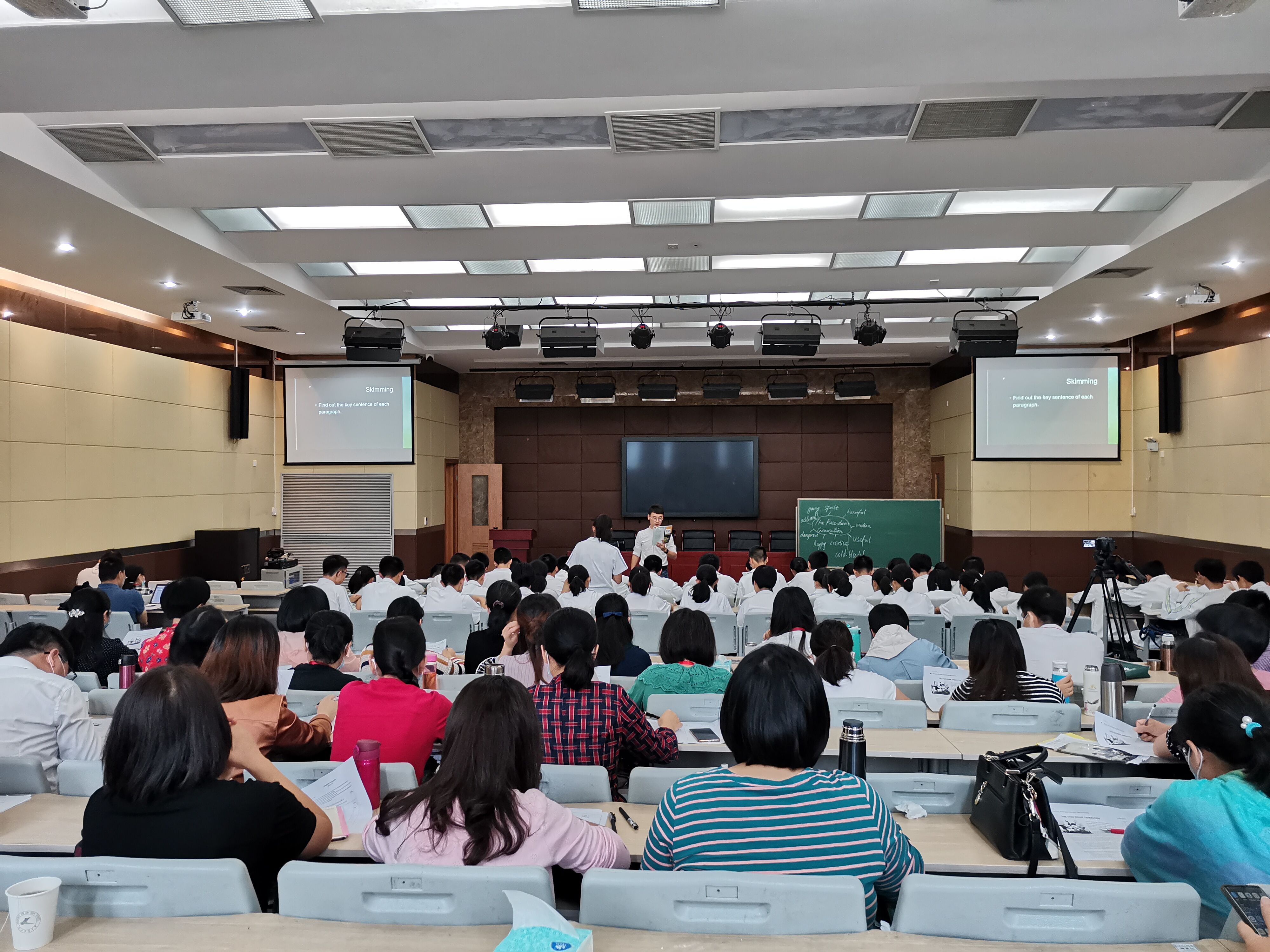 首先是跟随姜发兵指导老师,进行听课、备课、教案的记录和整理、学生作业的批改反馈等任务。在姜老师的指导下,一遍遍进行教案的修改提高,在实践中学习如何安排英语课堂。其次,也积极参加学校举办的英语教研活动,了解学军中学英语组的教学相关计划、观摩优秀公开课、以及聆听教学经验分享会等。除此之外,加入到相关的大型英语活动的组织,例如学军中学在本周举办的高二年级组单词大赛(Spelling Bee),永乐视频 研究生协助参与活动的组织,并担任单词朗读老师。