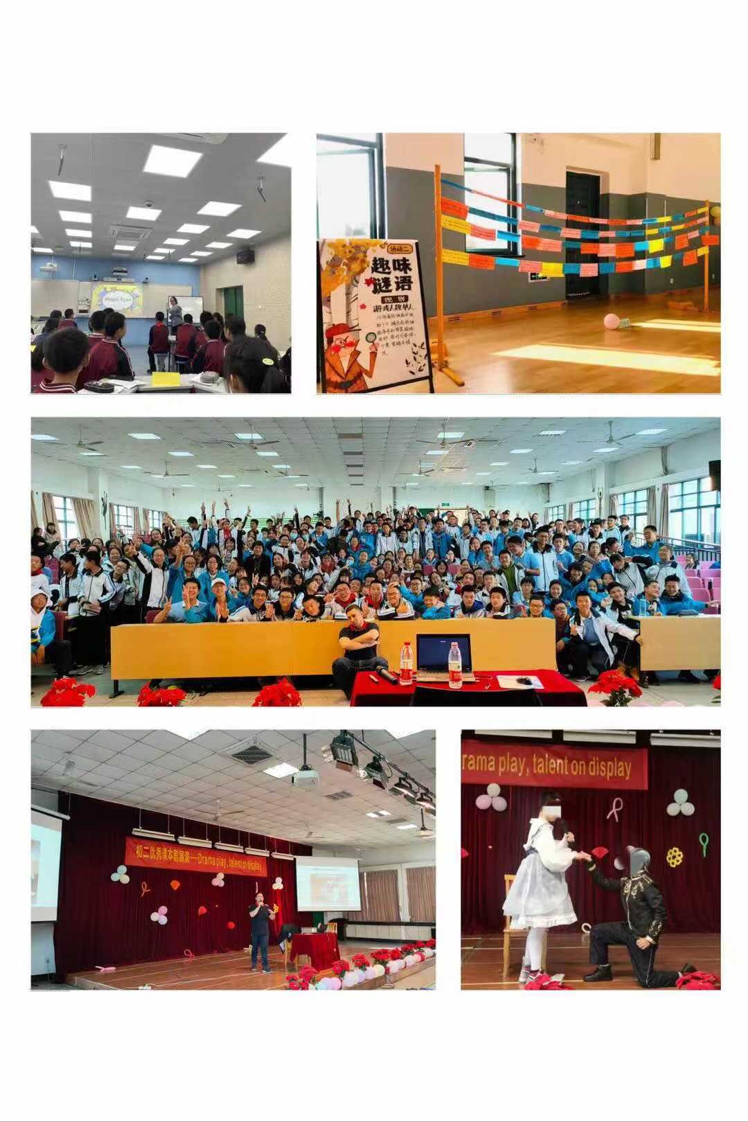 除了日常课堂教学外,实习生们不仅承担了大量的班主任工作,还一起参与策划本届双语成长节的活动。七年级在欢乐游园中徜徉,不仅治愈了学习的疲惫,又在玩中收获了新的英语知识。八年级同学的课本剧表演,从前期的剧本挑选和编写到中后期的演员挑选和排练,实习生们精心准备,全程参与指导。九年级的最强大脑,实习生们精心挑选题库,确定主题,从学生的角度出发设想问题,最后反响热烈,好评如潮。