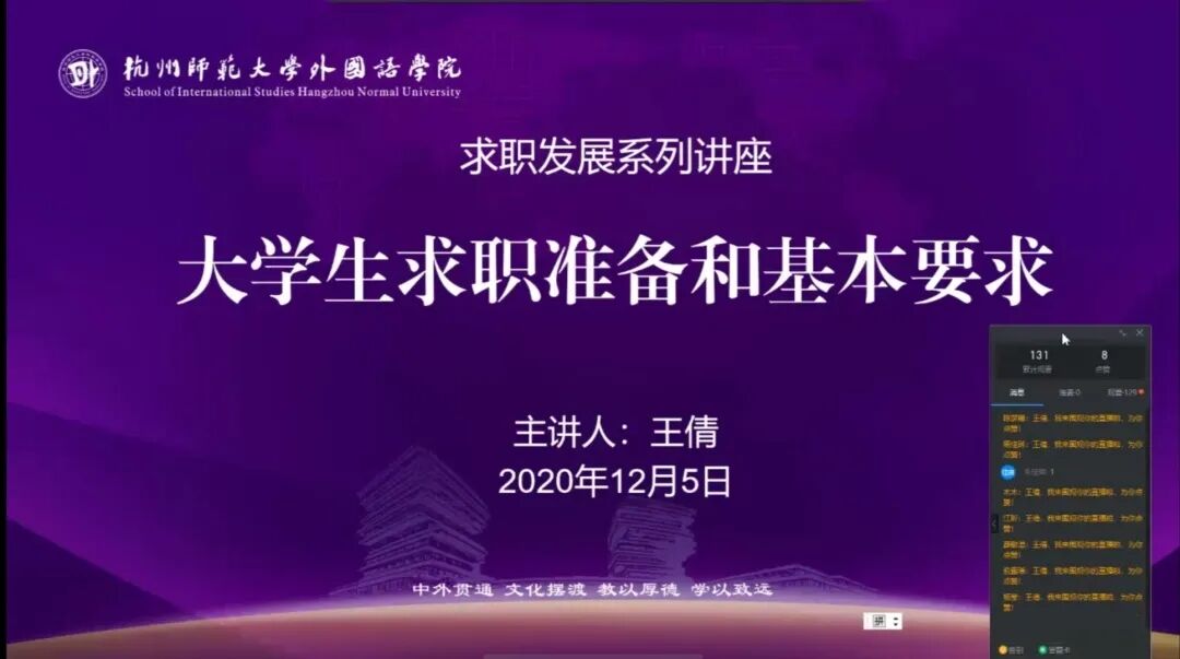 2020年12月5日,永乐视频 以钉钉直播的形式举办了求职发展系列讲座:《来,一起做老师吧!》和《大学生求职准备和基本要求》,分别邀请到杭州维翰学校国际交流中心主任方向军老师、永乐视频 党委副书记王倩老师担任主讲人。