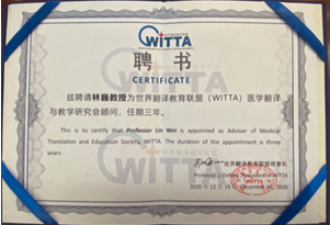 会上,林教授被世界翻译教育联盟(WITTA)医学翻译与教学研究会聘为顾问。