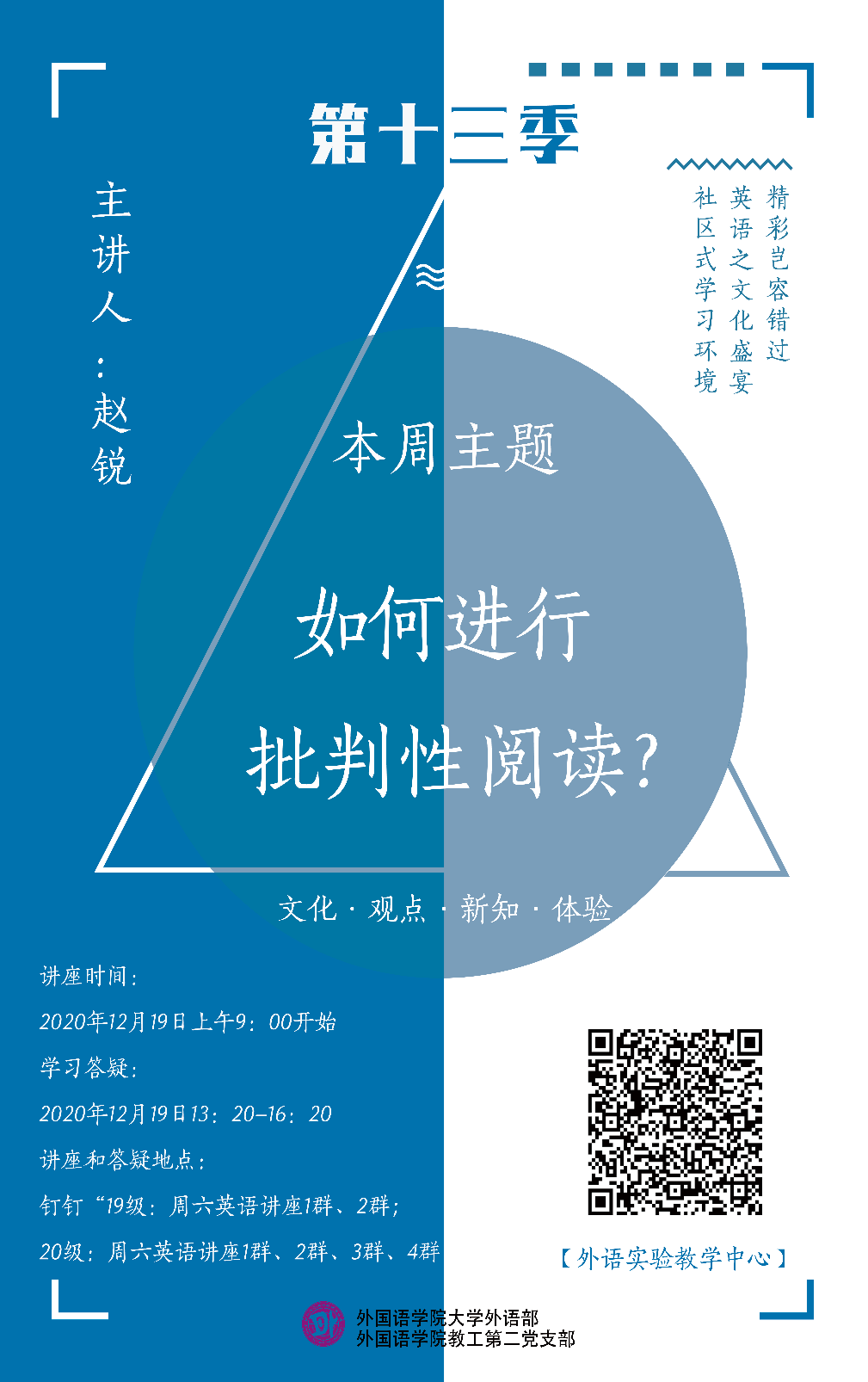 为了提高学生的阅读能力和培养批判性思维,2020年12月19日周六上午9点,大学外语部的赵锐老师特意为同学们带来了主题为“如何进行批判性阅读”的讲座。本次讲座主要针对学生在平时阅读中呈现的主要问题进行剖析,帮助学生意识到阅读并非只是对词汇和语法进行分析即可,更重要的是透过文字,进行“反思性思考”,变被动阅读为主动,要对所阅读的文本进行健康的怀疑, 开放的头脑,主动的质询,以及客观的评价,从而形成独立的认知,不会人云亦云。