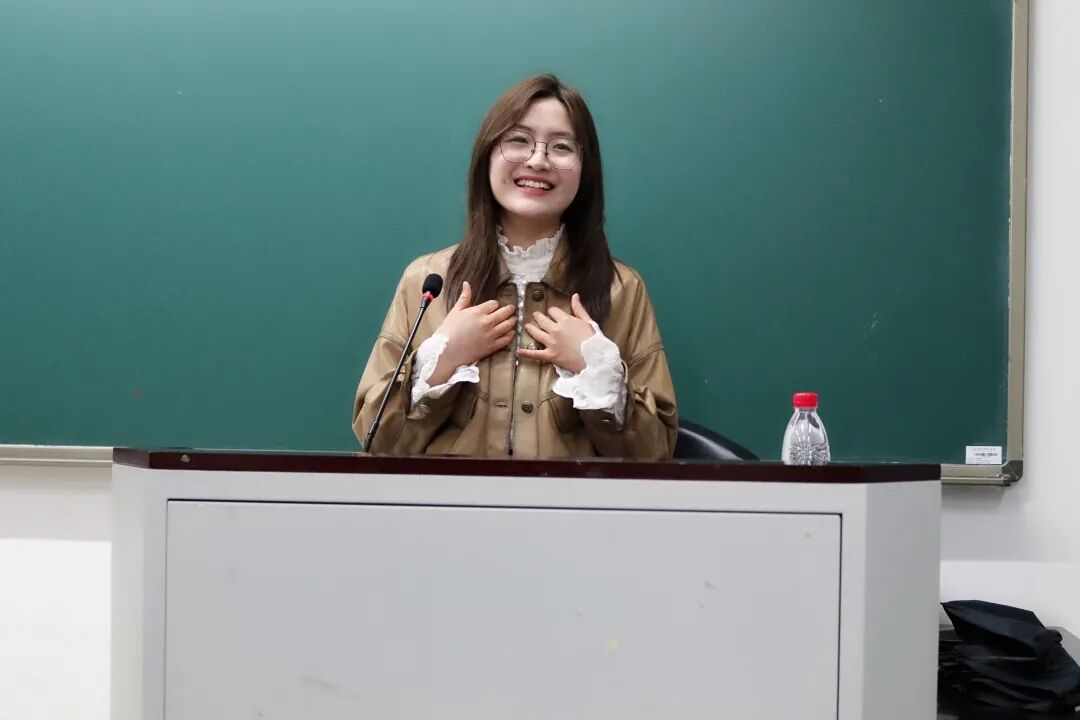 邱佳慧结合自身经历向大家分享了一些语言学习的经验。她坦言自己起初是抱着试水的心态去参加英语演讲比赛,但在取得一些成绩后,她逐渐变得自信勇敢,于是积极参加了多个国际演讲辩论赛、国际翻译志愿者等活动。在这些特殊经历中令她印象最深刻的是赴澳大利亚昆士兰大学访学的经历。在访学过程中,她真切地感受到了文化差异,当地老师不拘一格的教学方式、同学们的创造性思维模式和敢于表达的胆识刷新了她对于教育的认知。因此,她建议同学们走向世界,去体悟课本之外的真知灼见。