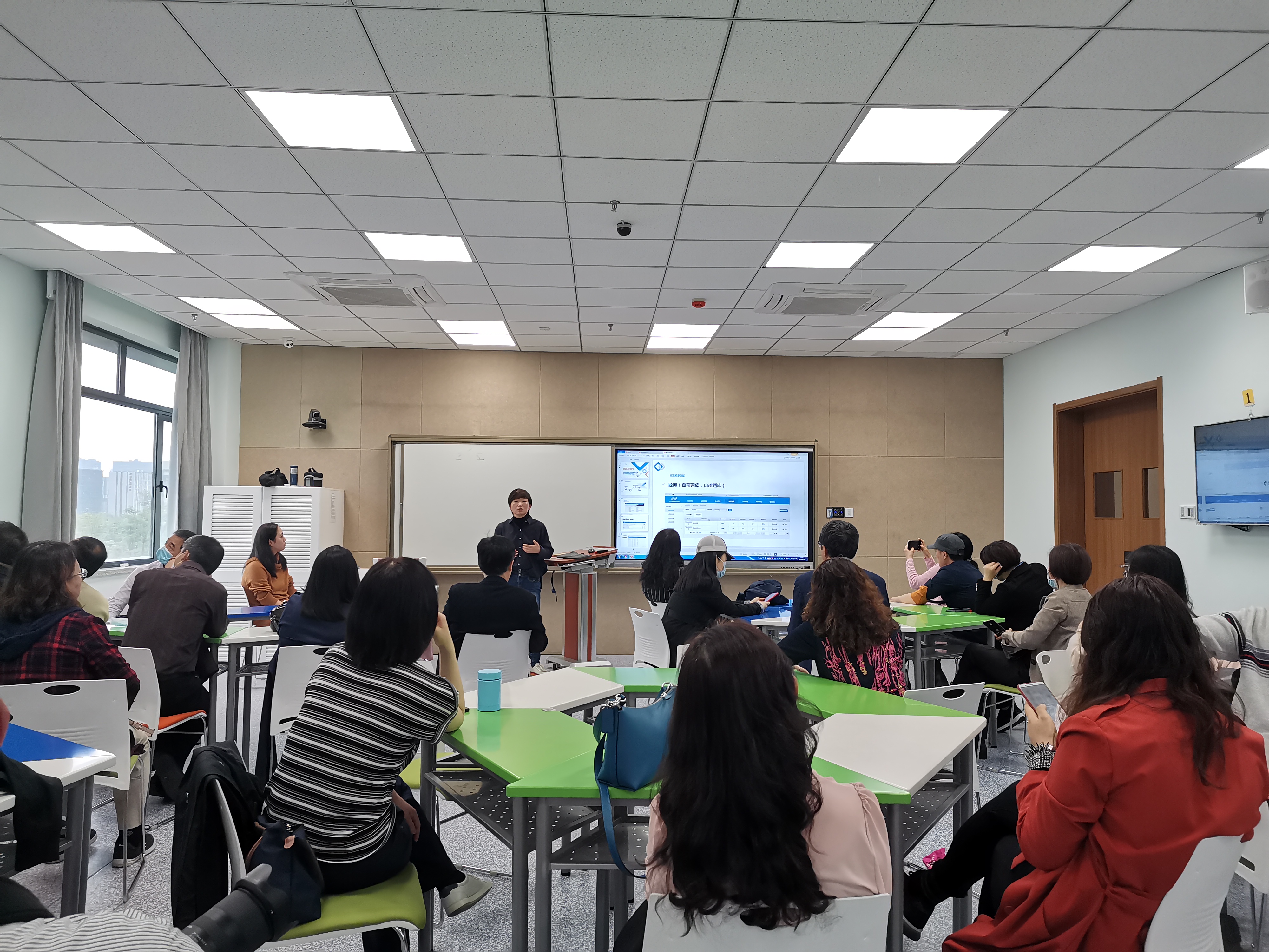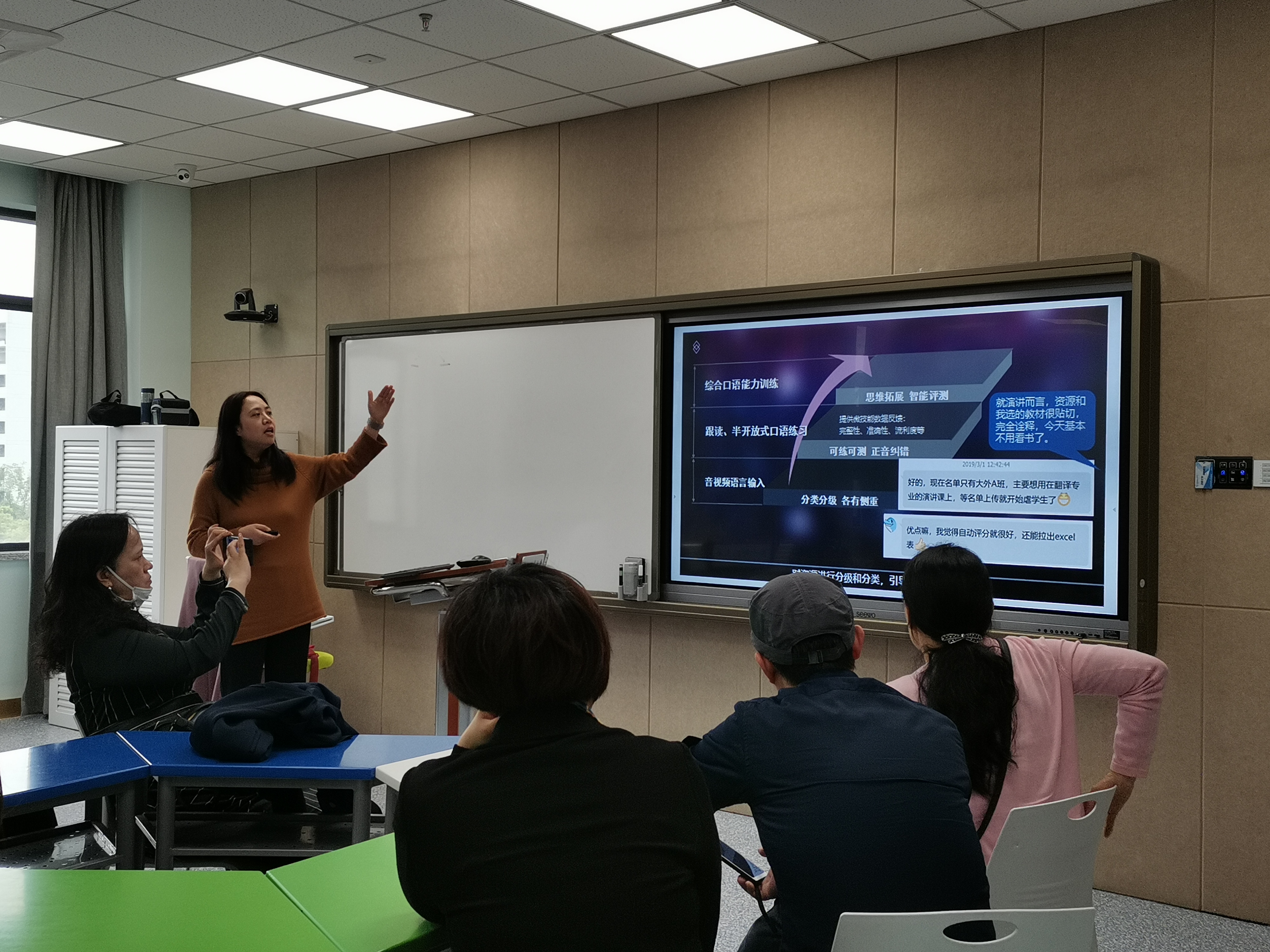在VR实训室亲身体验后,来访者来到勤园智慧教室区域,王剑晖老师从自身教学出发,生动详细地展示了如何结合智慧教室的设施、在线学习资源、课堂交互活动上好英语课,充分发挥学生的主观能动性,激发学习积极性,提升学习效率。管凌云老师介绍了智能化在线外语测试在永乐视频 的应用。