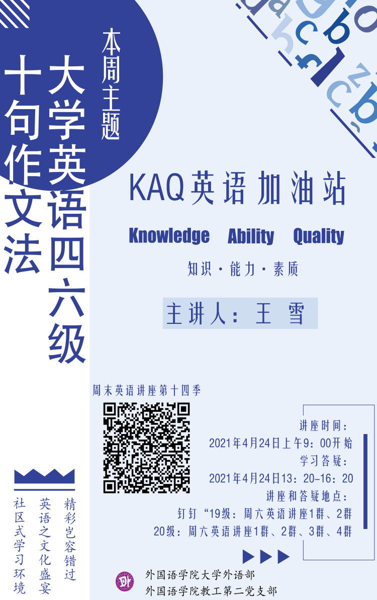 为了帮助同学们为即将到来的四六级考试做好准备,2021年4月24日周六上午9点,大学外语部的王雪老师给同学们带来了以“大学英语四六级十句作文法”为主题的讲座。讲座开始,王老师先介绍了中国水墨画创作中常用的一种手法——“留白”,王老师以南宋马远的《寒江独钓图》为例,引导学生领略中国水墨画留白“此处无物胜有物”的美感,同时指出,“留白”可以使画面构图协调,减少构图太满给人的压抑感,很自然地引导观众把目光投向主体。接着,王老师指出,四六级英语优秀作文的“谋篇布局”可以模仿水墨画中的“构图”,以避免写出“懒婆娘的裹脚布又长又臭的长而空洞的文章”,并在30分钟内写出150~180词汇的有思想,有内容,层次清晰,文字通顺的短文。最后,王老师提出了自己独创的十句作文法精髓,即:水墨中国画,留白才会美;英语四六级,三点定高分。运用这个方法可以使四六级作文“麻雀虽小,五脏俱全”,并具有起首短,正文短和结尾短的特点。