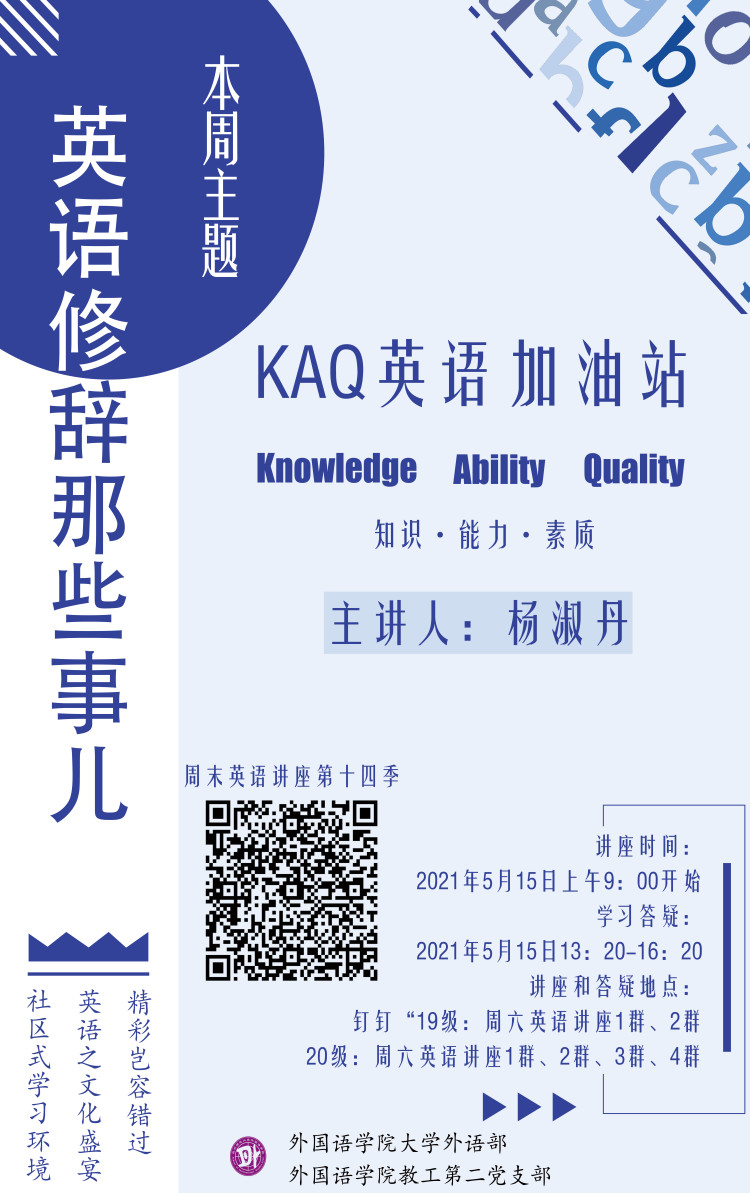 为了提升学生的英语写作鉴赏水平,2021年5月15日周六上午9点,大学外语部的杨淑丹老师给同学们带来了以“英语修辞那些事儿”为主题的讲座。杨老师在简单介绍了英语修辞定义后,让学生做了一个问卷调查,得知学生对英语修辞了解的不多,基本局限于最基础的明喻、暗喻、拟人、夸张、拟声等几种修辞手法。之后,杨老师通过来源于知名外刊大量原汁原味的英文,进一步向学生介绍了常见英语修辞手法,如用典、仿拟、双关、押头韵、反讽等共计21种修辞手法。讲座采用的案例紧扣时事,如“日本核废水倾倒事件”等,让学生在轻松氛围中获取知识,初步了解了常见的英语修辞手法,从而在以后的英语学习中更能体会语言之美,并提升英文写作水平。