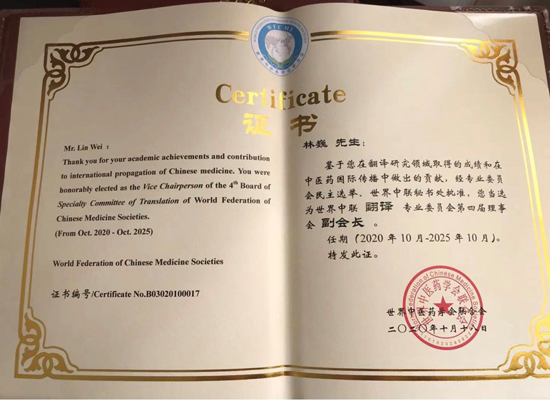 鉴于林巍教授在翻译研究领域取得的成绩和在中医药国际传播中做出的贡献,经世界中医药联合会翻译专业委员会民主选举、世界中联秘书处批准,永乐视频 林巍教授当选为世界中联翻译专业委员会第四届理事会副会长,任期至2025年10月。这是林巍教授第四次续任此职。