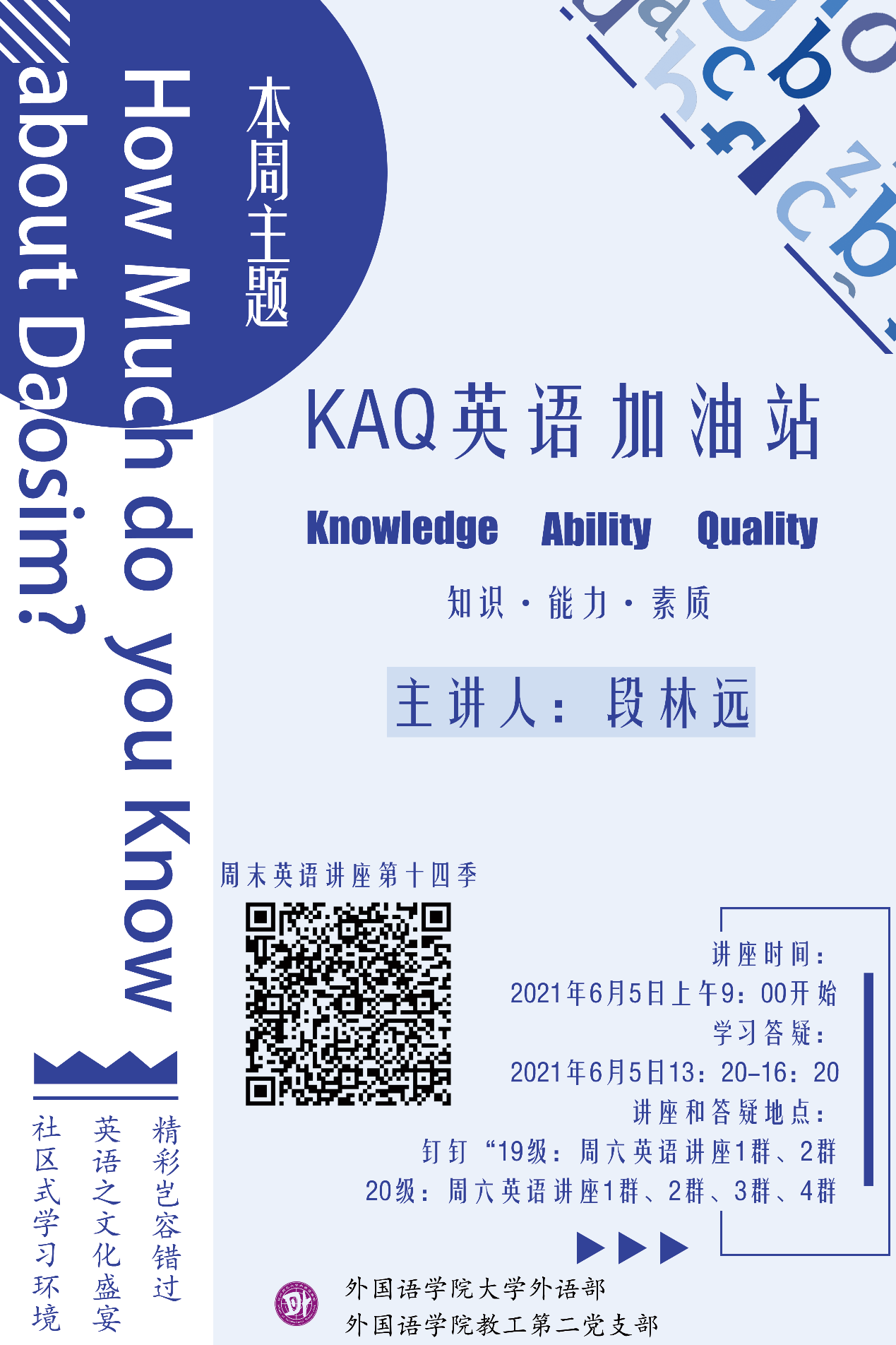 2021年6月5日上午,永乐视频 大外部的段林远老师为同学们带来了一场《How much do you know Daoism》的专题讲座。段老师重点梳理了作为宇宙起源的“道”的内涵,以及老子认为的宇宙万物都是在相互对立的状态下形成的辩证法思想,使学生认识到就像万事万物都有两面性一样,每个人都有其长处和不足。最后,段老师告诉同学们:“在生活我们既要善于发现自己的长处,认识到自身的价值,同时也要看到自己的不足和他人的长处与价值,从意识到人与人之间的相互依赖性,以及合作的重要性。”