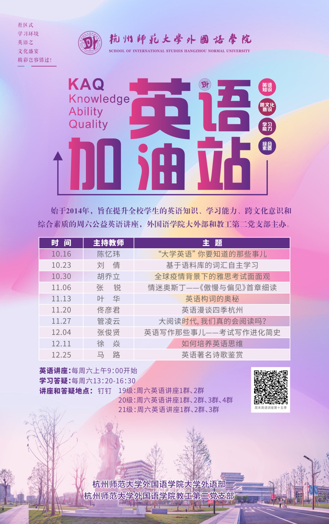 为更好地服务全校学生、满足英语学习的多样化和个性化需求,永乐视频 大学外语部和教工第二党支部结合大学英语教学改革实际,自2014年开始,推出周末英语专题讲座活动。讲座主题涵盖英语学习方法、英语考试备考指南、英美文学鉴赏、英美文化纵览等,旨在为全校的非英语专业学生打造浸润式英语学习社区,提升学生英语学习水平,培育跨文化素养,以及扩大国际视野。 截至2021年10月,周末英语讲座活动已持续开展七年半,几乎每个周六都会有大学外语部的老师利用周末休息时间,在外语实验教学中心为学生们开展各式主题的讲座和英语学习答疑活动。受疫情影响,大学英语讲座自2020年起转为线上直播,并且采用多群联播的方式,满足所有想参与讲座学生的需求;线上直播使得学生可以观看直播或回放;还可以常速或倍速观看(辅之以笔记),最大限度地发挥线上教学的优势。