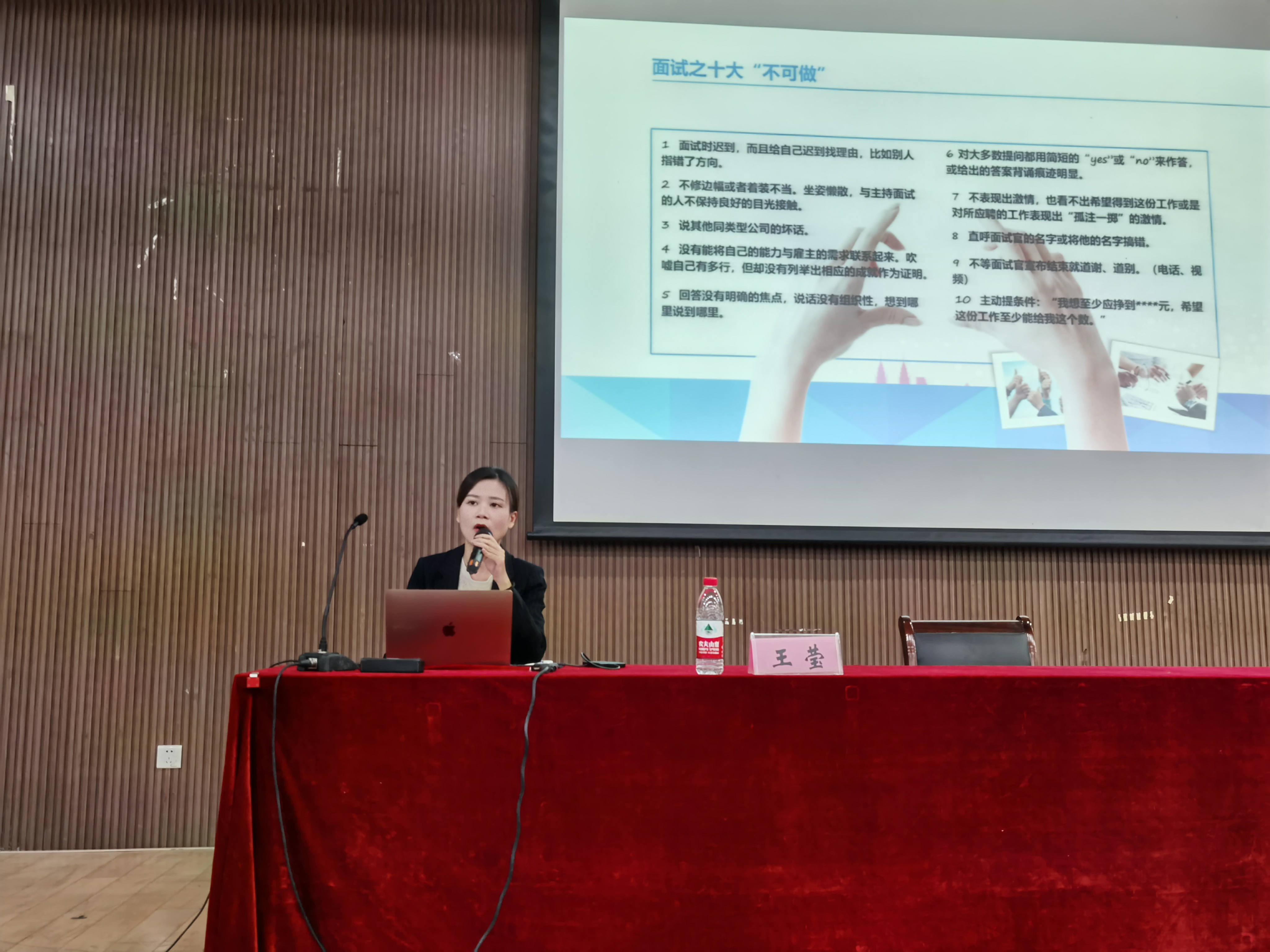在讲座中,王莹老师主要从求职视觉形象礼仪和求职社交形象礼仪两大方面展开,向学生阐述了在求职面试中的礼仪与技巧。老师指出,求职视觉形象礼仪主要体现在一个人的仪容、仪表、仪态上,而简洁大方、干净整齐是求职视觉形象礼仪的主要原则。此外,在妆容、着装与表情方面,王莹老师也告诫学生不要披肩散发,表情要微笑,并带有真诚、自信,眼神要坚定、柔和、友善,目光要做到公务凝视、社交凝视、亲密凝视。在求职社交形象礼仪方面,王莹老师主要分成面试前,面试中,面试后三个小部分进行讲解,详细分析了面试的“十大不可做”。