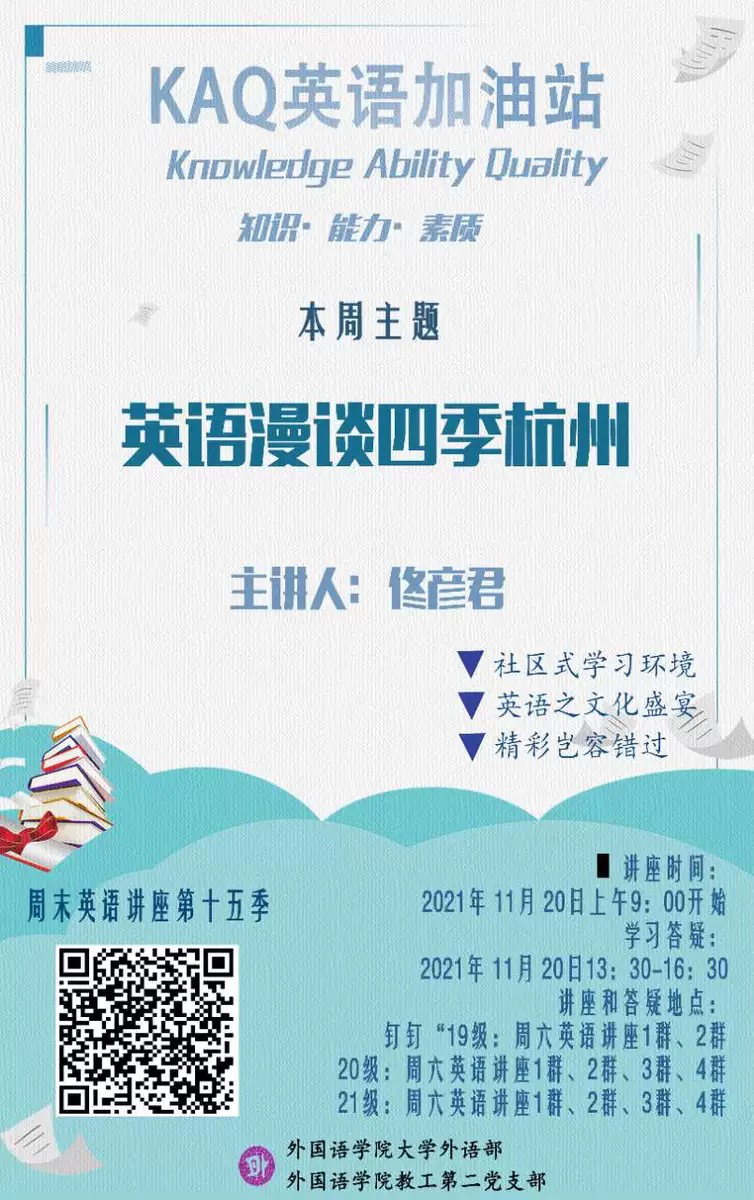 为了帮助同学们学会用英文介绍杭州,讲好中国故事,2021年11月20日周六上午9点,大学外语部的佟彦君老师特意给同学们带来了以“英语漫谈四季杭州”为主题的讲座。
