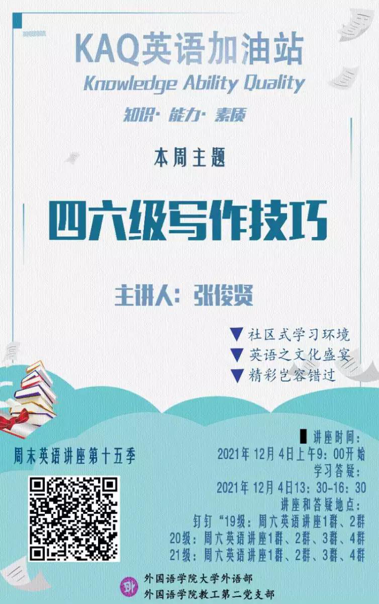 为了提高同学们的写作能力,2021年12月4日周六上午9点,大学外语部的张俊贤老师给同学们带来了题为“英语四六级写作技巧”的讲座。