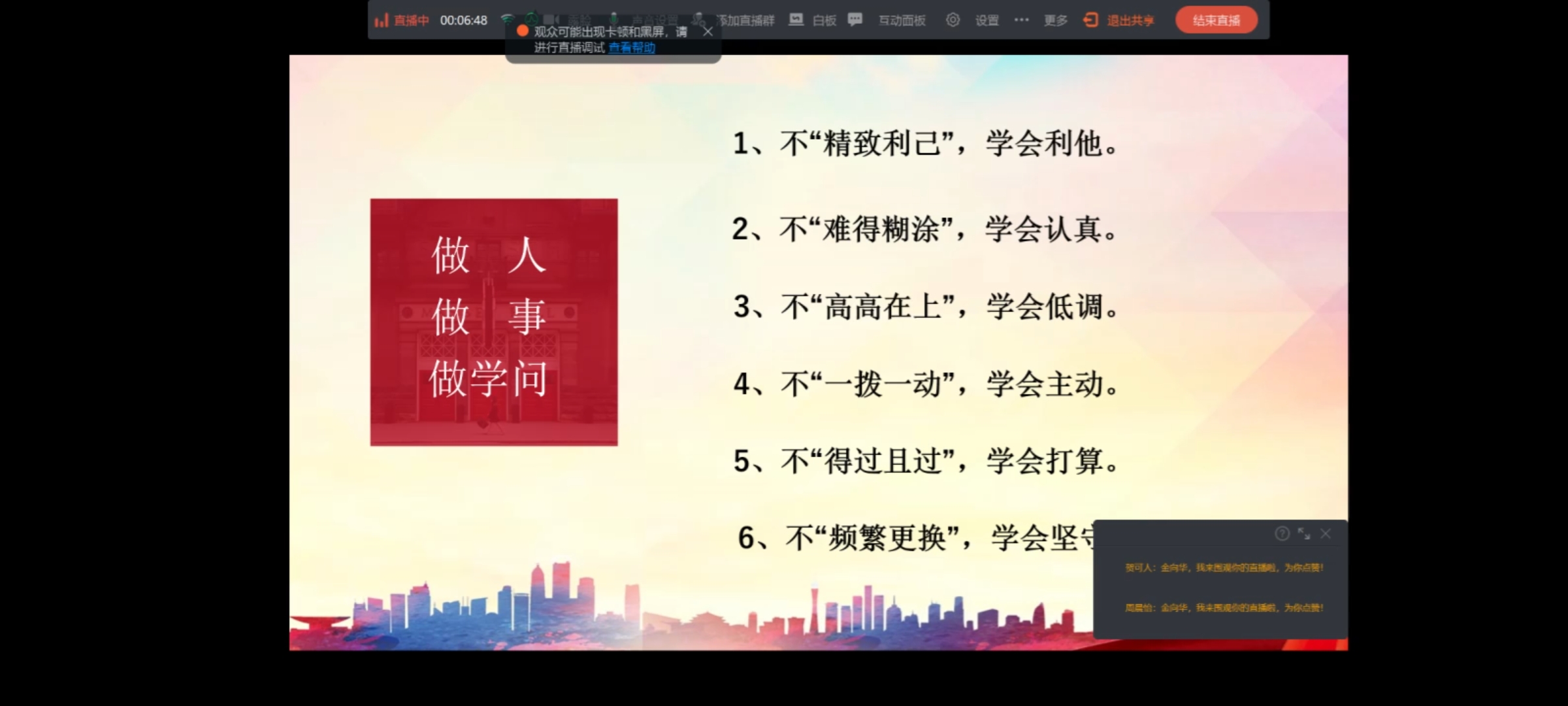 2021年12月18日晚,永乐视频 “菁烁”学生骨干领导力训练营以钉钉线上直播形式顺利开展。讲座由永乐视频 党委学生工作部部长、学生处处长金向华主讲,永乐视频 副书记娄丹华主持,全体学生干部参加。