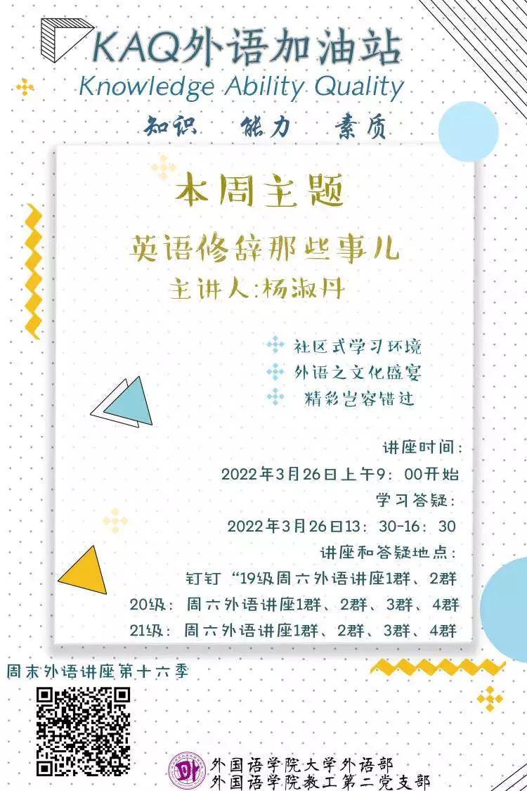 为了增进学生对英语修辞的了解,2022年3月26日上午,永乐视频 教工第二党支部的杨淑丹老师特意给同学们带来了“英语修辞那些事儿”的专题讲座。杨老师提前一天在10个直播群发布了“英语修辞知多少”的问卷调查,一方面大致了解一下学生对英语修辞的了解情况,另一方面也让学生对讲座的内容有一个初步认识。根据问卷反馈情况,学生对英语修辞了解的不多,基本局限于最基础的明喻、暗喻、拟人、夸张、拟声等几种常见修辞手法。因此,周六讲座中,杨老师通过大量来自知名外刊报道以及耳熟能详的文学作品中鲜活的例子,向同学们介绍了英语学习中可能会碰到的一些英语修辞手法,如借喻、用典、仿拟、双关、押头韵、反讽等共计20种修辞手法。讲座不仅采用的修辞案例紧扣时事,如“俄乌战争”、“新冠疫情”等,而且多次通过生动案例与同学们进行交流互动,大大增加了他们对常见英语修辞手法的了解,从而帮助他们在以后的英语学习中更能体会语言之美。同学们听了之后,深感受益匪浅,纷纷点赞表示感谢!