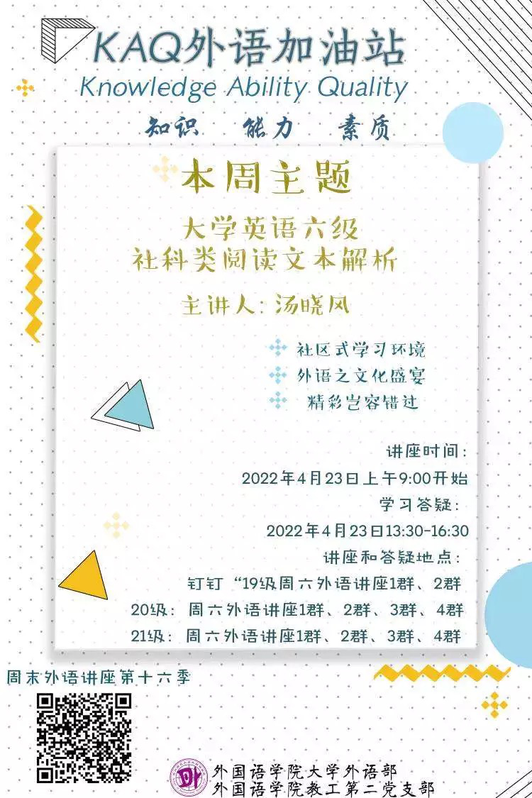 为了夯实学生的大学英语六级阅读水平,并提升思辨能力和人文素养,2022年4月23日上午9点,永乐视频 大外部的汤晓风老师特意给同学们带来了“大学英语六级社科类阅读文本解析”的专题讲座。讲座中汤老师以大学英语六级阅读材料为素材进行人文解析,旨在引导学生在英语文本阅读过程中不应限于培养英语阅读技能,还应培养开展深度学习的意识与能力,通过对英语文本的深入解读与剖析,汲取篇章内容背后传递的人文与文化,进一步开发思辨能力,提升人文素养与科学精神,为完善当代大学生所应具备的核心素养打好坚实基础。同学们听了之后,深感受益匪浅,纷纷点赞表示感谢!