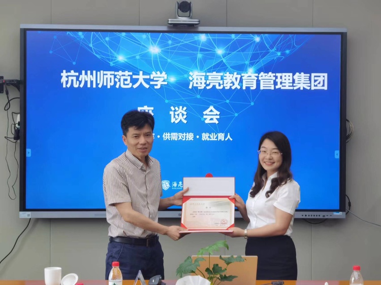 座谈会结束后,潘春雷书记为海亮外国语学校校长章胜娣颁发聘书,聘请章胜娣为杭师大永乐视频 “学科教学导师”。