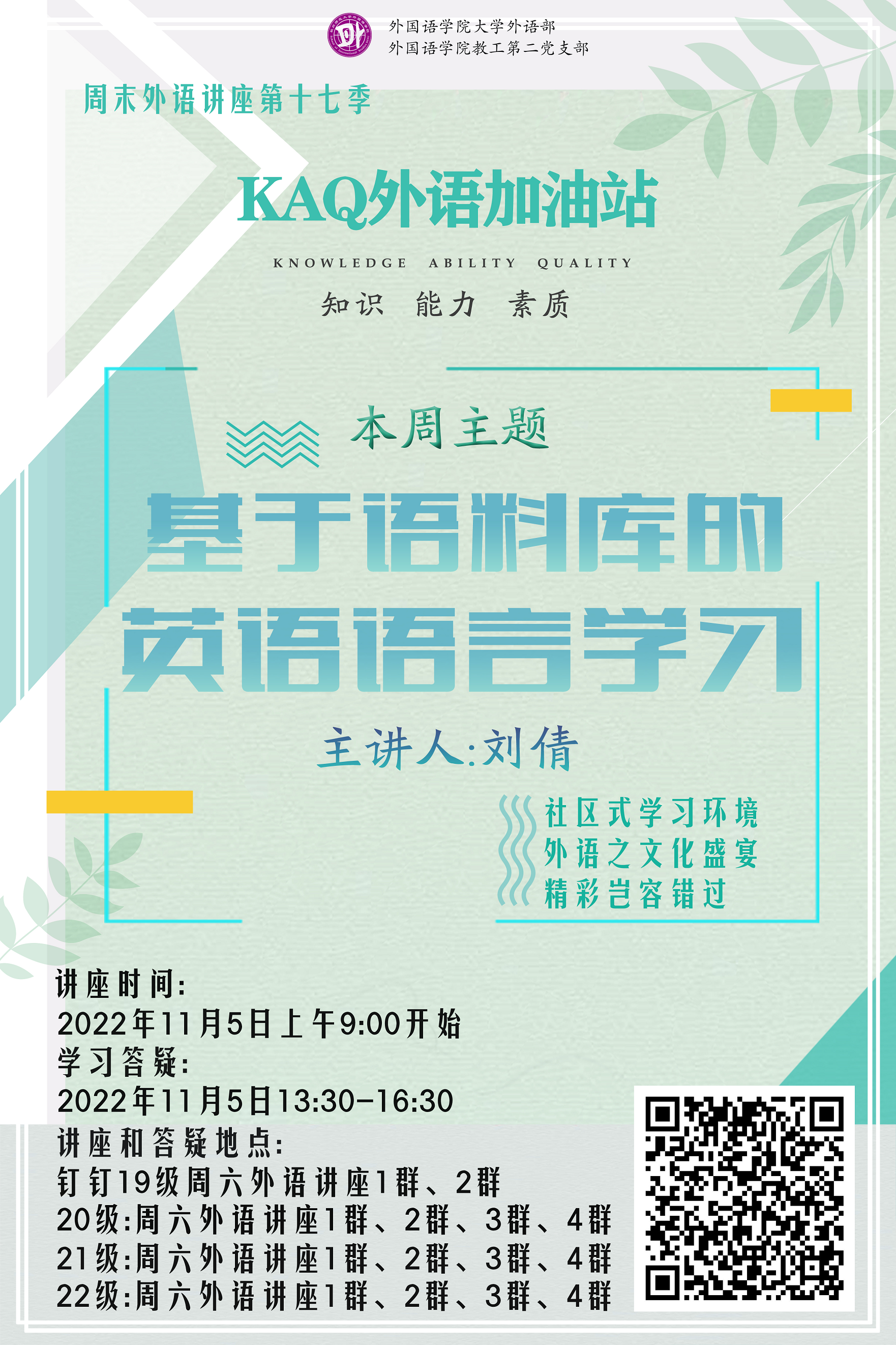 为了满足师大学生在外语能力上“一精多会”和“一专多能”的需求,“周六外语公益讲座——‘KAQ(知识、能力、素质)外语加油站’”,秉持一贯的SIM(student-centered, Innovative,Multilingual)理念,坚持“以生为本、不断创新、多语种国际视野”。考虑到学生对于英语文学知识等方面的广泛兴趣,特邀请大外部的刘倩老师于2022年11月5日给同学们带来了一场题为“基于语料库的英语语言学习”的讲座,并通过14个钉钉群进行线上联播。