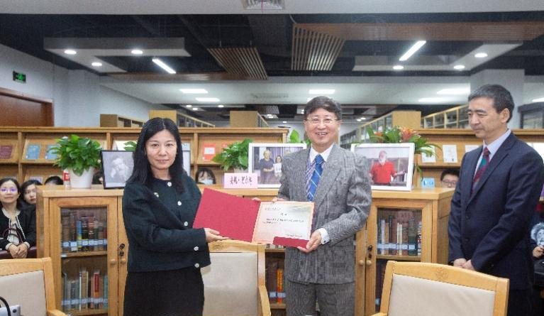 周敏院长在致辞中真诚感谢两位教授的慷慨捐赠,并指出这些涉及多民族、多文化的文学图书在纷繁复杂的当下国际环境中对于建设人类命运共同体的价值所在:“文学与共同体研究,能够为我们在分崩离析的现实生活中,构建出超越意识形态翻译、彼此公约的情感基石,成为推动人类命运共同体研究的理论抓手。”她强调,这个捐赠本身就是对共同体建设的一次实践。致辞后,周敏院长宣布“外国文学与共同体研究中心”启动,并向研究中心主任殷企平教授和副主任管南异教授颁发了聘书。