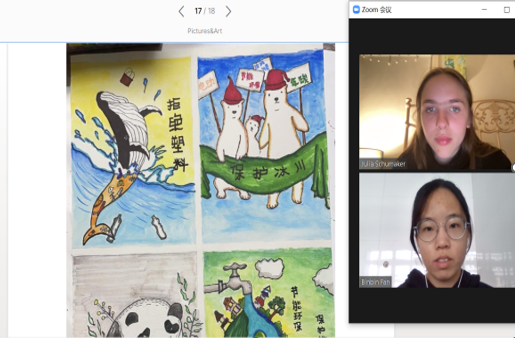在两个多月的深入交流之后,每个小组的两位同学合作制作了海报,展现双方对同一主题的不同理解。12月6日上午8点半,“双语桥”线上交流总结会正式开始,双方代表通过zoom会议连线展现了项目成果,表达了代表们对中美文化异同的观点。不同的文化和思想在一张张小小的海报上碰撞,展现了世界文化的多元丰富。