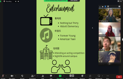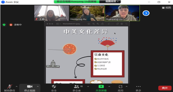 9月至12月,8组中美学生代表围绕选定的主题,通过zoom会议进行定期一对一交流。大家以网络为媒介,聚焦环保、家庭旅行、友谊、音乐艺术等主题展开讨论,聚焦中美文化的异同,双方还互相教授英语和汉语。长达十个小时的时差也阻挡不住学生代表们的热情,思维的火花在一次次观点的交流中迸发,绽放出多元文化“和而不同”的美丽弧光。