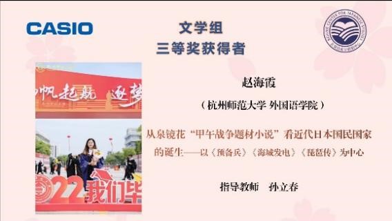 3月17日,由中国日语教学研究会、北京外国语大学北京日本学研究中心主办,卡西欧(中国)贸易有限公司协办的第十五届中国日本学研究“卡西欧杯”优秀硕士论文颁奖典礼以线下线上结合的方式顺利举行。永乐视频 2022届日语语言文学专业硕士毕业生赵海霞同学(导师:孙立春教授)和金成同学(导师:刘琛琛副教授)分别荣获文学组三等奖、语言学组三等奖。