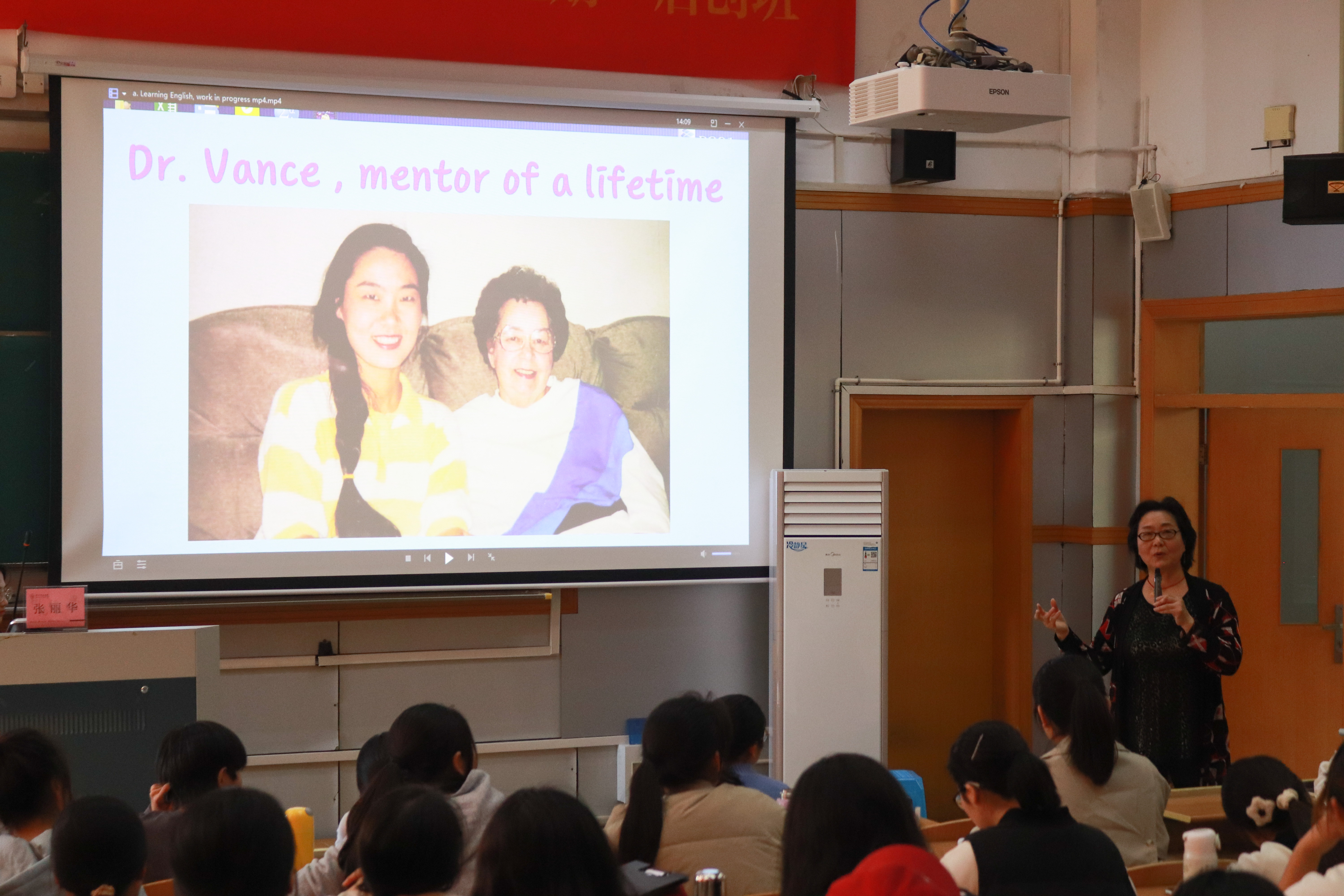 随后,张丽华校友讲述了自己在美留学的经历,并将其称作“intermediate”。她提到,这一时期的英语学习需要融入文化,对于英语地道表达地掌握尤为关键。她也感谢了求学期间遇到的人生导师Dr. Vance,让她在异国他乡感受到温暖,更好地提升了英语水平。