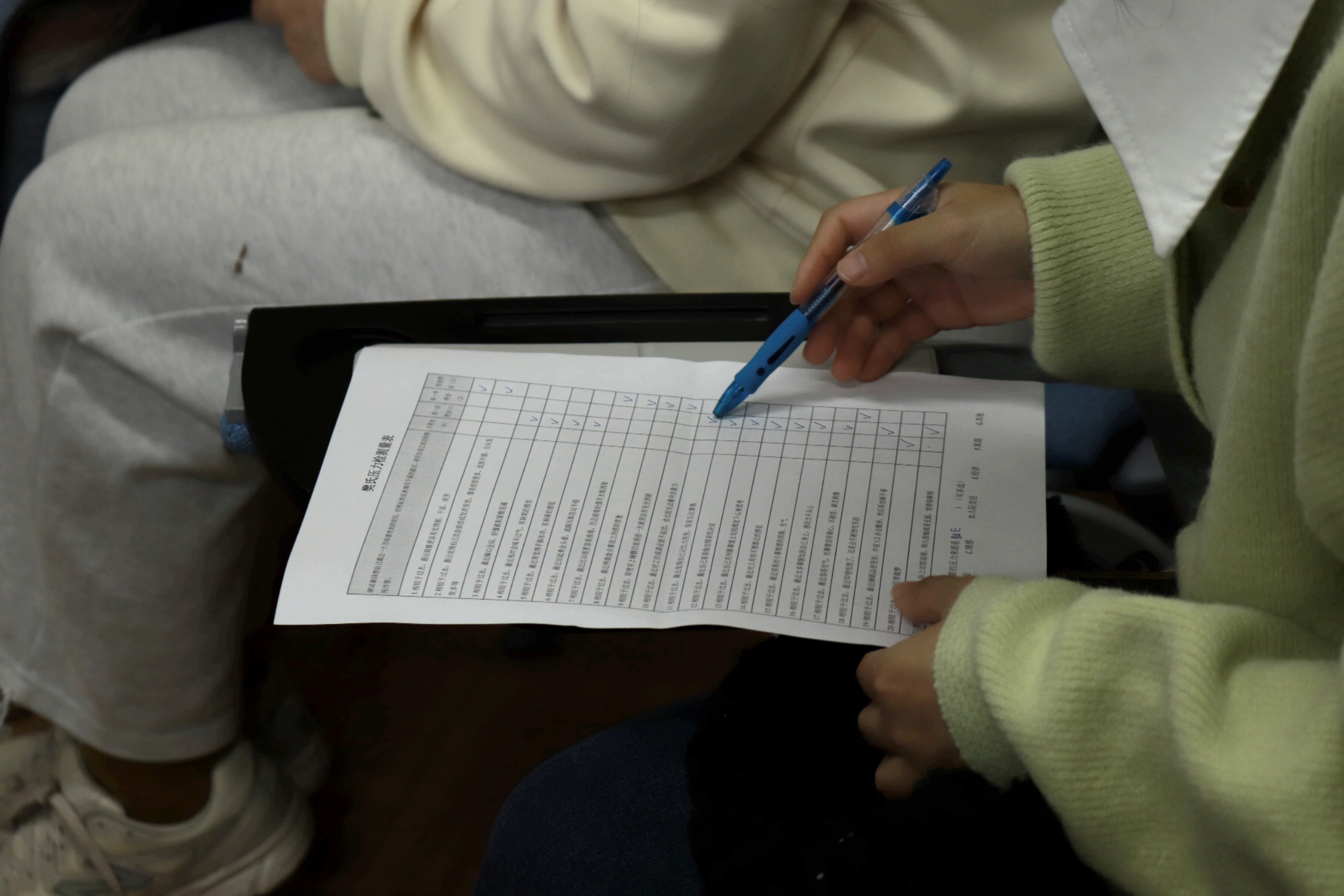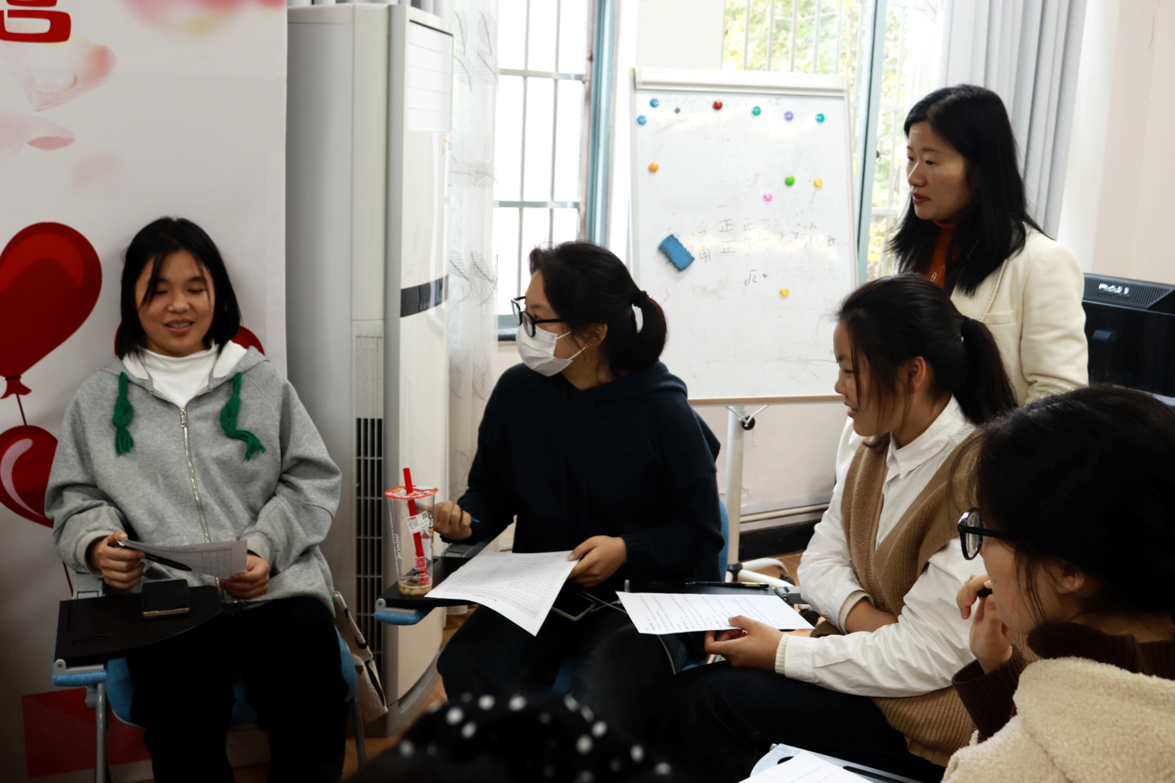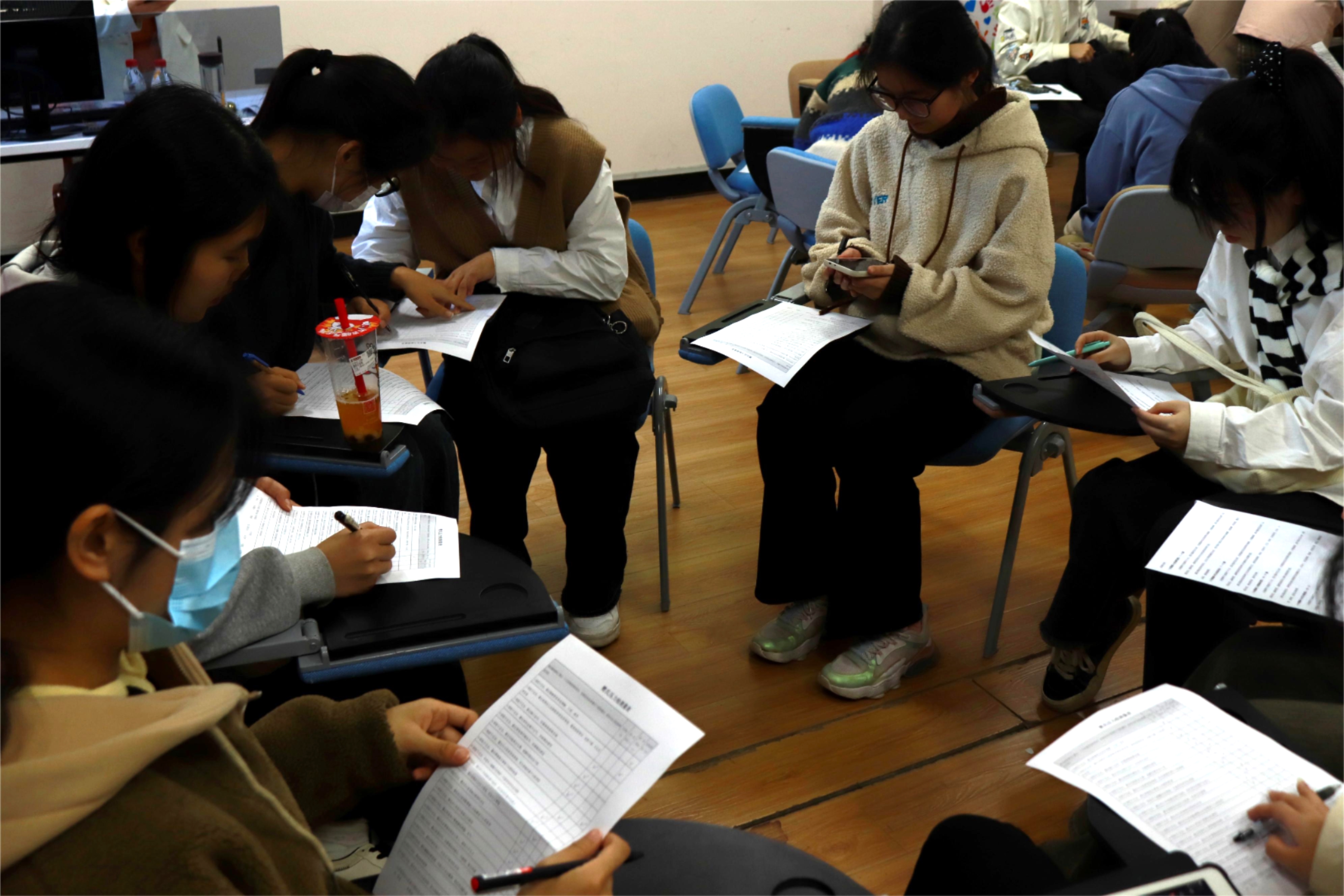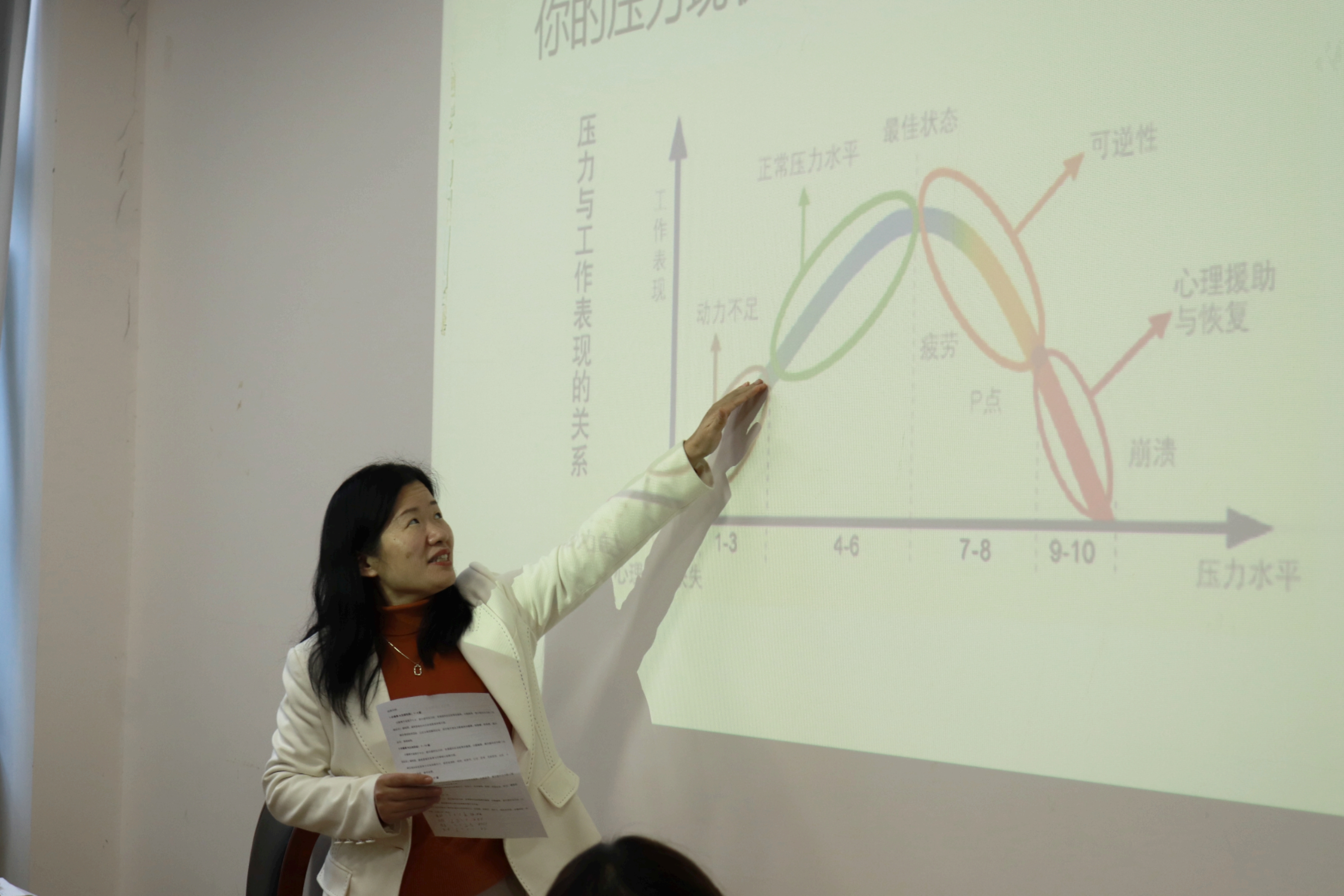 讲座伊始,周凤琴老师给同学们下发了一张压力测试调查表,以让大家对自己近期的压力状况有一个大致了解。以问卷调查表为切入点,周凤琴老师给出了一张压力与工作表现的关系图并讲述了压力过大的一些身体警讯。她指出,我们工作时应当注重效率,从生理、认知、情绪、行为四个层面思考,而非在单一的时间维度上进行考量;当感到过度疲惫时,应该停止工作,及时进行压力的缓解。随后,她让在场的三组同学进行测试结果的交流,各组同学热情分享了自己的压力状况,增进了对自己和彼此的了解。