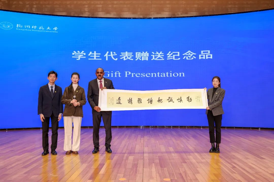 演讲结束后,永乐视频 学生代表温亮、宋亚芳、王成向布朗赠送了题有永乐视频 校训“勤慎诚恕 博雅精进”的书法作品,解释其涵义并合影留念。现场气氛热烈,掌声不断。“总理先生的讲话提升了我们对促进中外文化沟通交流的主人翁意识,我会加强专业学习,用国际表达方式讲好师大故事,杭州故事,中国故事。”2022级研究生金添说。在场的外语学院2021级学生华碧岑表示,“总理先生的演讲让我加深了对中安两国关系的认知,进一步提升了我对加勒比国家文化研究的兴趣。”2021级学生张蓝心听了演讲后深受鼓舞,“总理先生提出了对青年学生的期望,我们会努力涵养领导之才和责任之心,为中国乃至世界的发展贡献一己之力。”