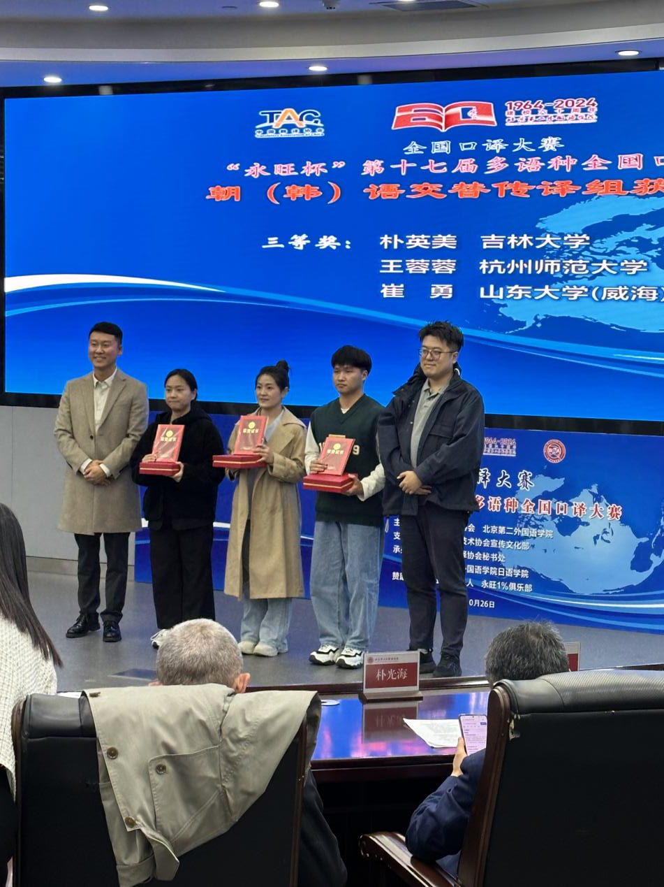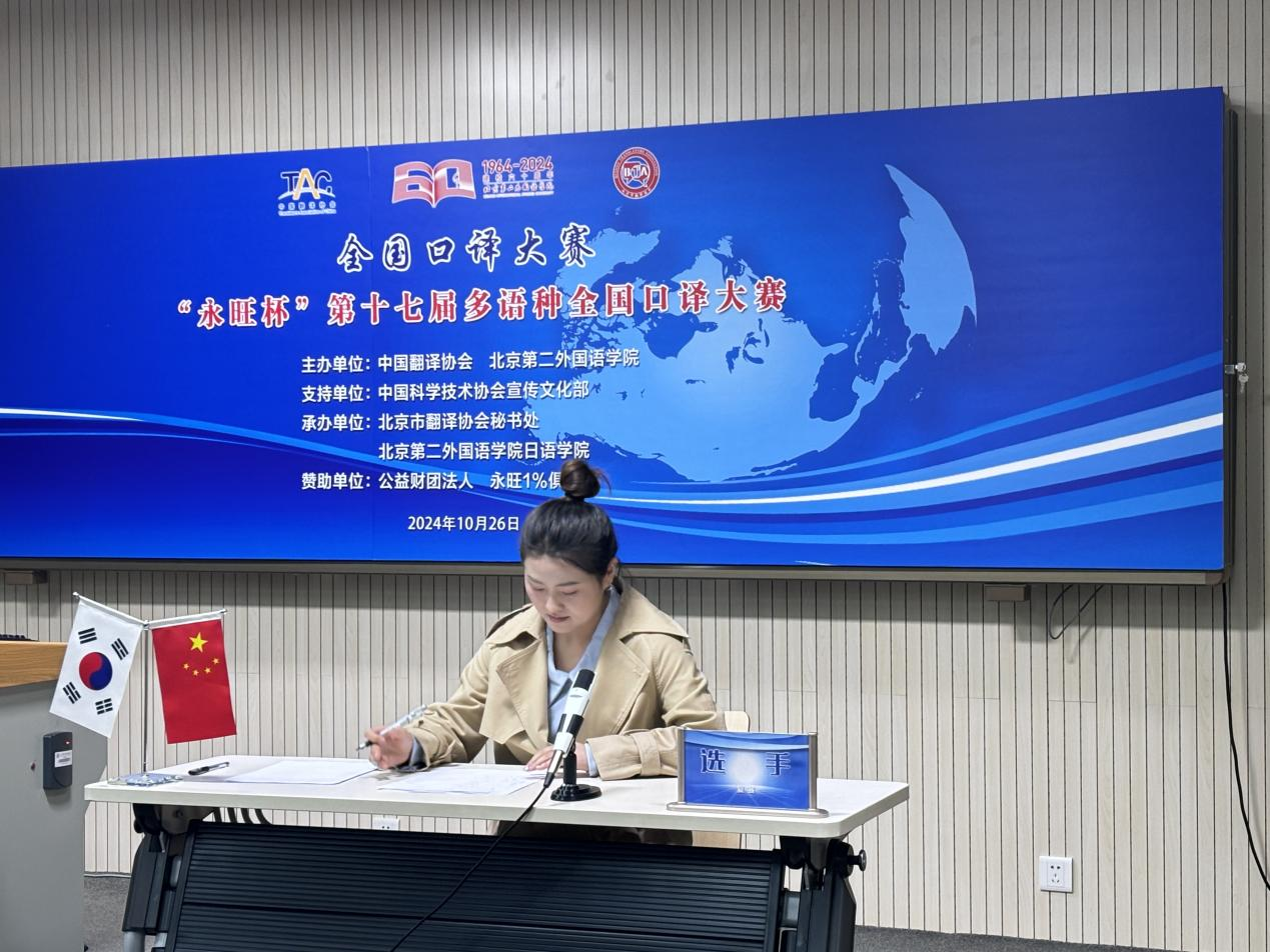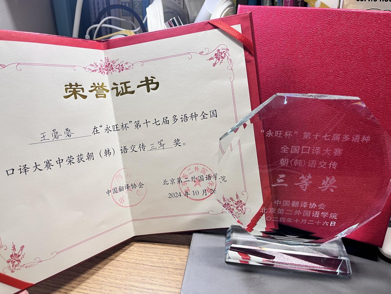 10月26日,第十七届“永旺杯”多语种全国口译大赛在北京落下帷幕。永乐视频 2022级朝鲜语口译专业研究生王蓉蓉斩获“永旺杯”第十七届多语种全国口译大赛中朝(韩)语交传组三等奖。
